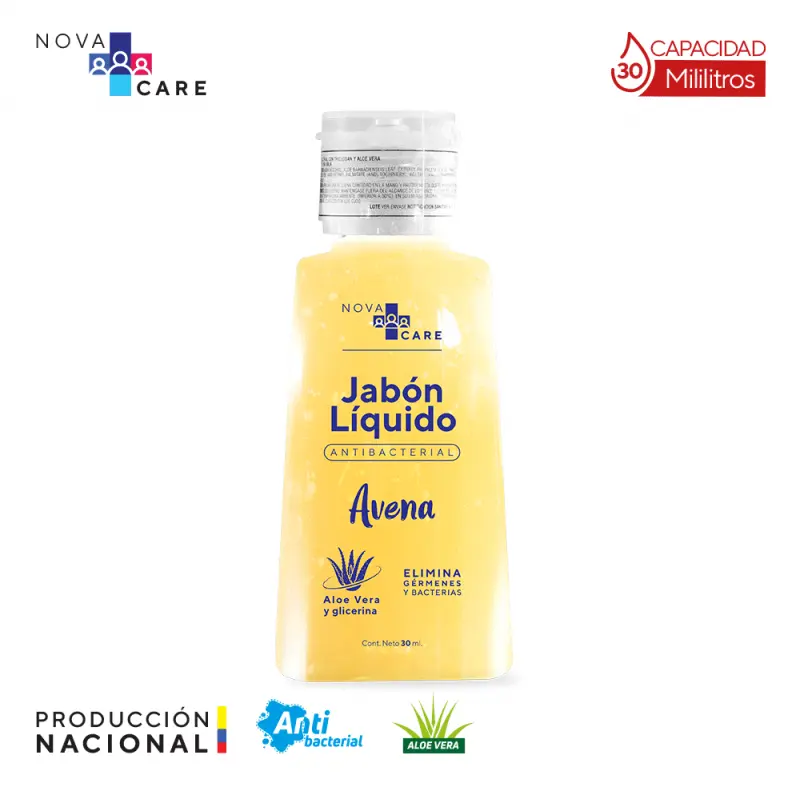 JABÓN LÍQUIDO ANTIBACTERIAL perlado especialmente desarrollado para el lavado de manos, con mezcla de agentes limpiadores y humectantes, contiene ingredientes antimicrobianos cuya función principal es controlar la contaminación por microorganismos, trayendo consigo la prevención de virus y enfermedades como infecciones de piel, gastrointestinales, entre otras.Su contenido de glicerina y extracto de aloe, son humectantes que ayuda a prevenir la resequedad de la piel y Clorhexidina que elimina gérmenes y bacterias, Jabón Novacare deja la piel más hidratada, tersa y perfumada.Aroma: Avena / Frutos Silvestres.30 ml.Colores diferentes bajo pedido, consulta con tu asesor tiempos de entrega.