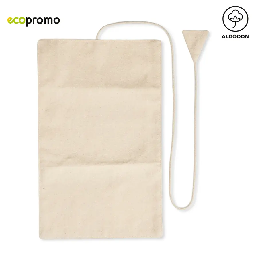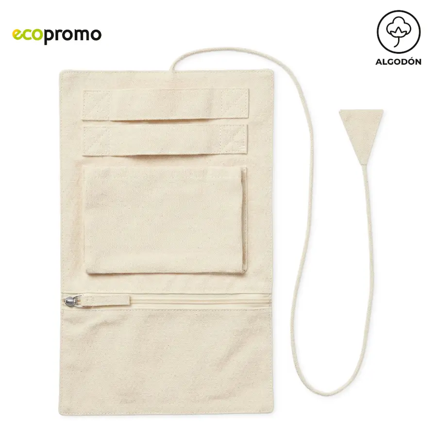 Joyero plegable en algodón. Incluye dos cintas para colgar objetos, un bolsillo sin cremallera y un bolsillo con cremallera. Incluye cordón para cerrarlo. Empaque Bolsa Individual