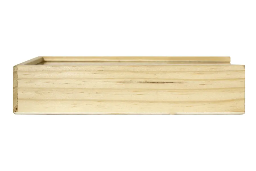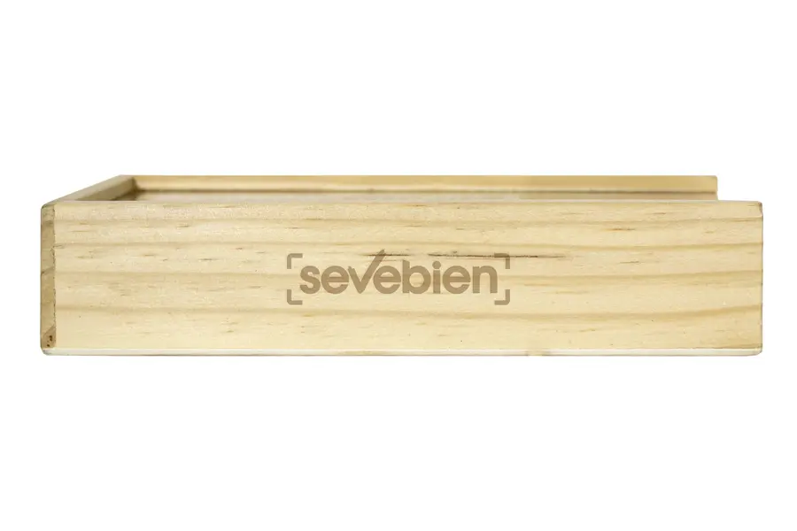 15 x 5 x 3 cm. Plástico y madera. Juego de domino con 28 piezas plásticas, caja de madera y tapa plástica transparente. Manual de instrucciones dentro de la caja. Presentación en caja de regalo.