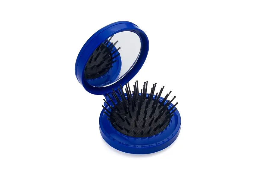 Espejo con cepillo redondo para cabello. Incluye un costurero con 6 hilos de colores, 2 agujas, gancho nodriza, enhebrador y 2 botones.