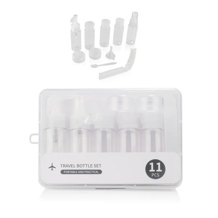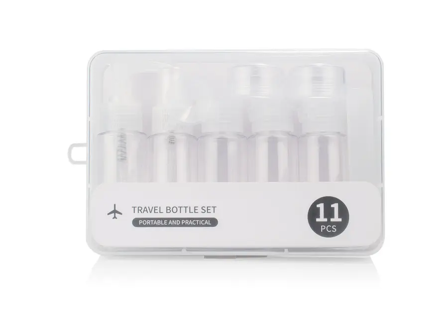 Set de botellas de plástico para viajes hechas en PET/PP. Ideales para transportar líquidos y cremas con facilidad, protegiendo la higiene de los productos.