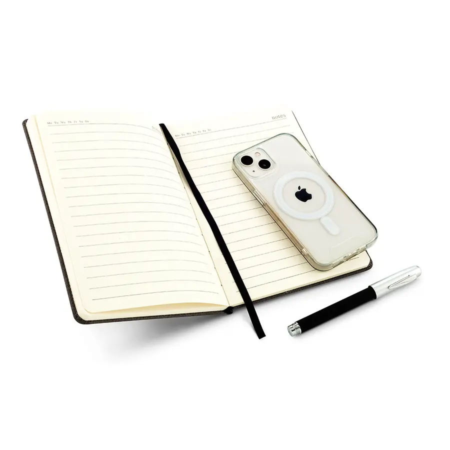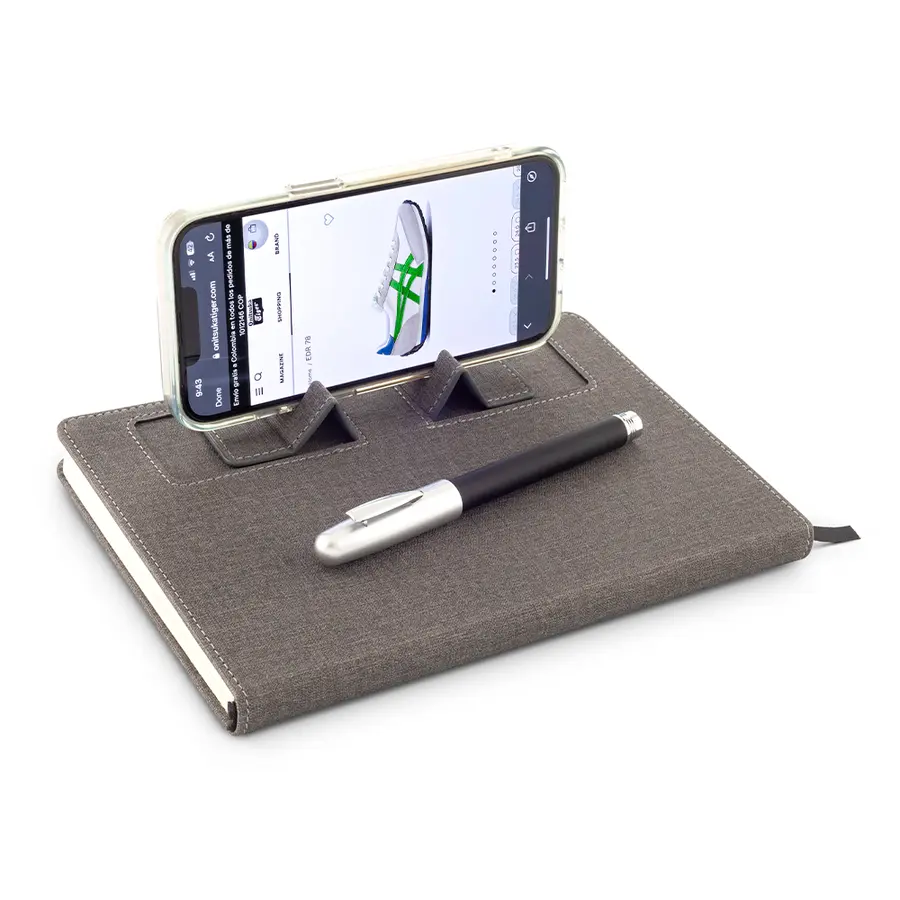 Libreta en políester, con dos orejas que funcionan como soporte para el celular. 112 hojas rayadas color crema.