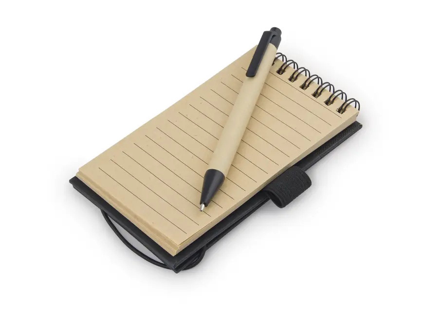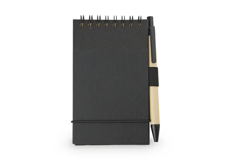 Libreta pequeña con argollado doble «O», de 60 hojas rayadas en papel reciclado con bolígrafo plástico de color similar y portabolígrafo. Tamaño aproximado A7.