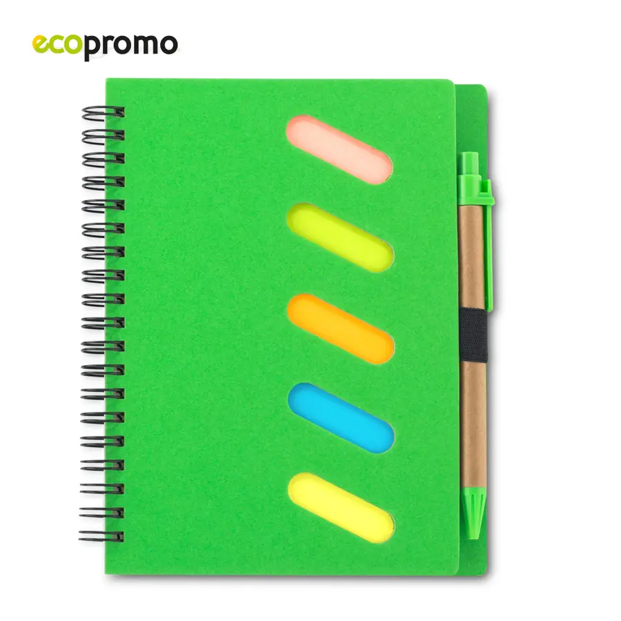 Libreta doble argolla y bolígrafo de cartón. 50 hojas. Cinco stickies de colores – 20 hojas cada uno.