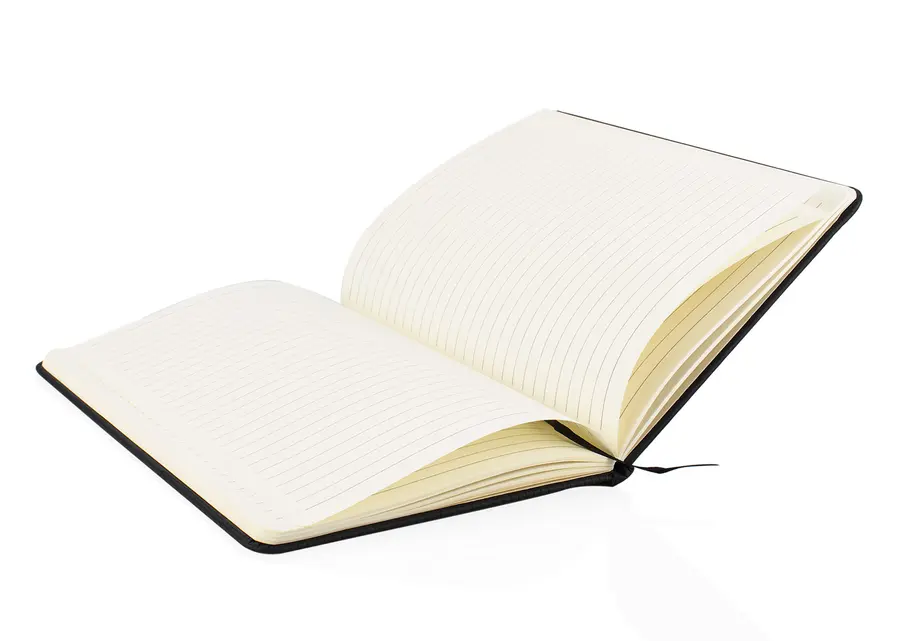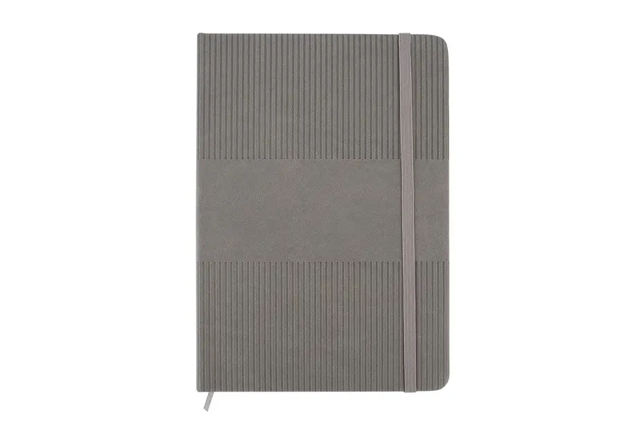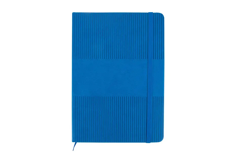 Libreta elegante con cubierta frontal en PU térmico grabado con rayas verticales y cubierta trasera en PU termo, que le da un acabado sofisticado y resistente. Contiene 80 hojas de papel de 70 g/m² con impresión lineal, ideal para escritura cómoda y organizada. Incluye cinta marcadora y banda elástica para mantenerla cerrada de forma segura.