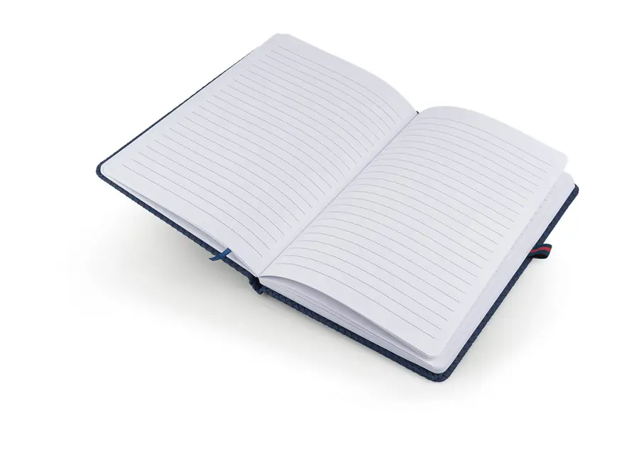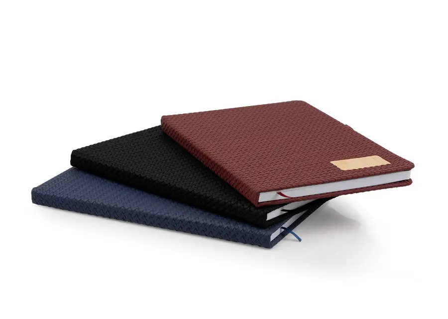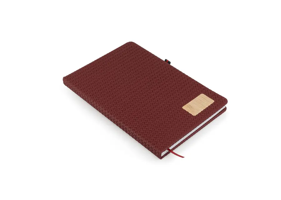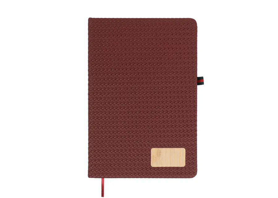 Libreta de cubierta dura forrada en algodón. Tiene una cinta separadora para mantener referencia de ubicación. Placa de bambú en la cubierta para impresión de marca. Contiene 80 hojas rayadas y el tamaño aproximado de la hoja es: A5.