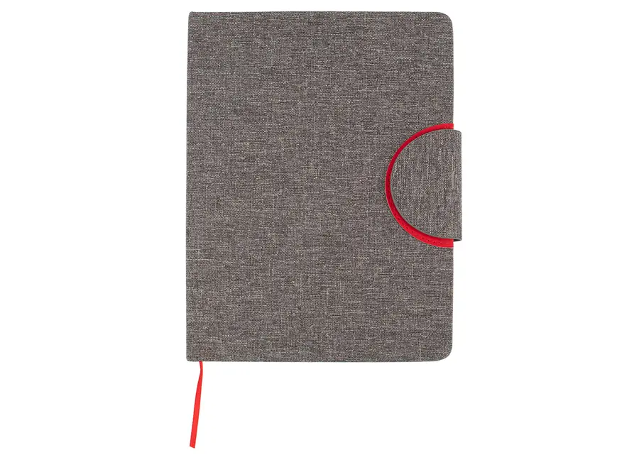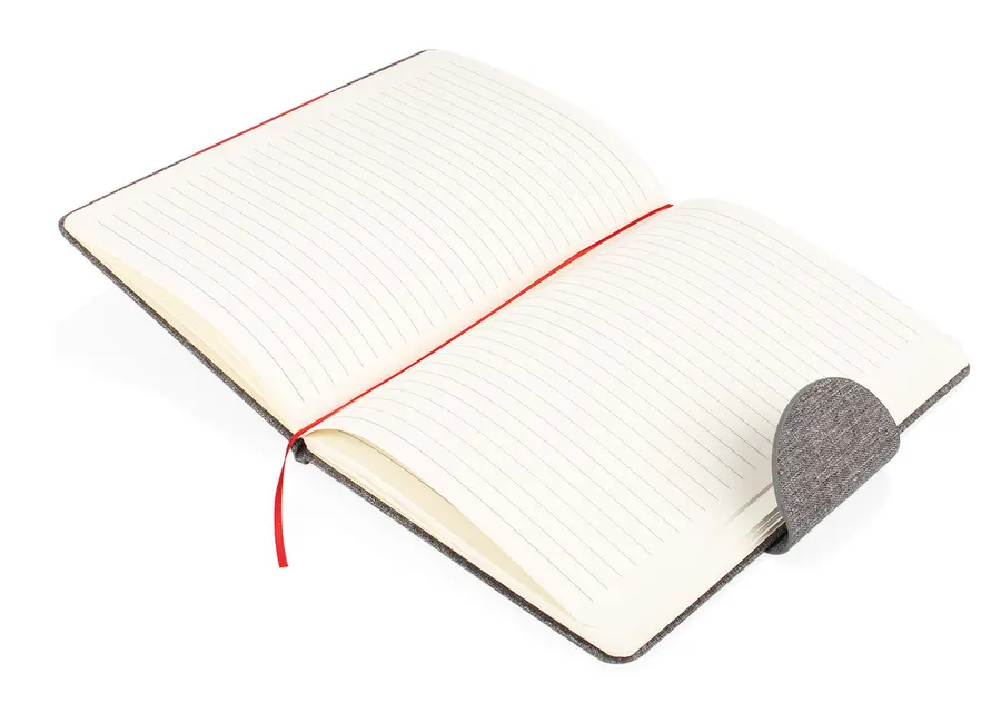 Libreta ecológica con tapa dura en PU de color combinado con tela RPET, que ofrece un diseño moderno y sostenible. La contraportada está fabricada en tela RPET y cuenta con una hebilla magnética que mantiene la libreta cerrada de forma segura. En su interior, incluye 80 hojas de papel rayado de 70 g/m² e incorpora una cinta marcadora para facilitar la organización.