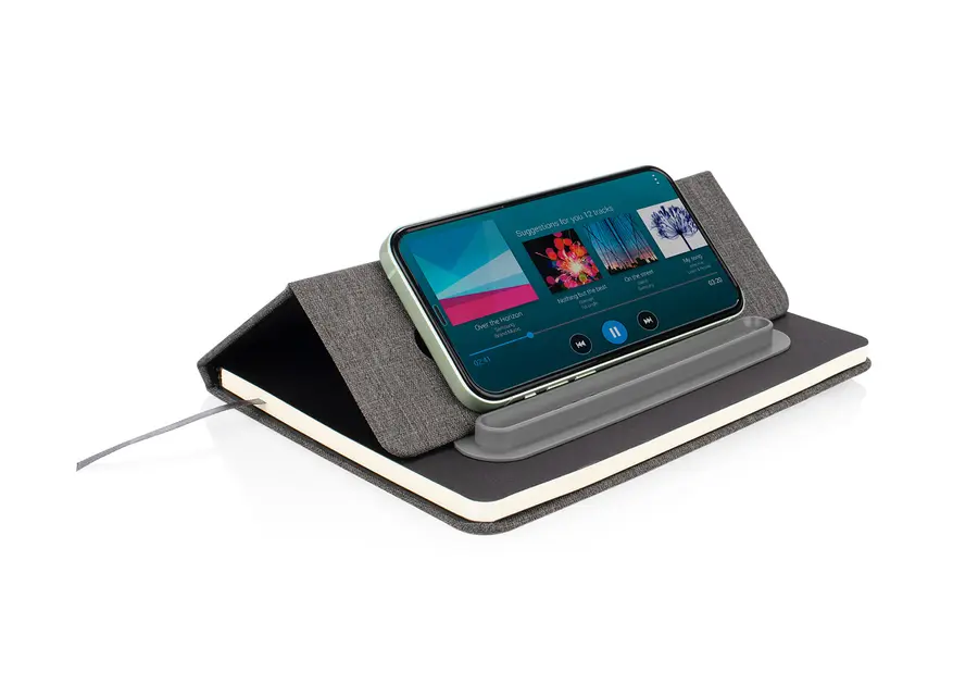 Cubierta de tapa dura de tela RPET. 80 hojas de papel interior de 70 g/m² rayadas, tamaño A5. Banda elástica, cinta separadora y portalápices de plástico con imán. No incluye bolígrafo.
