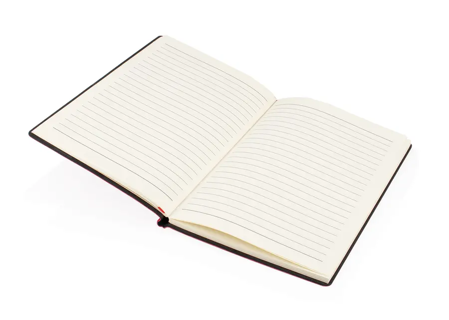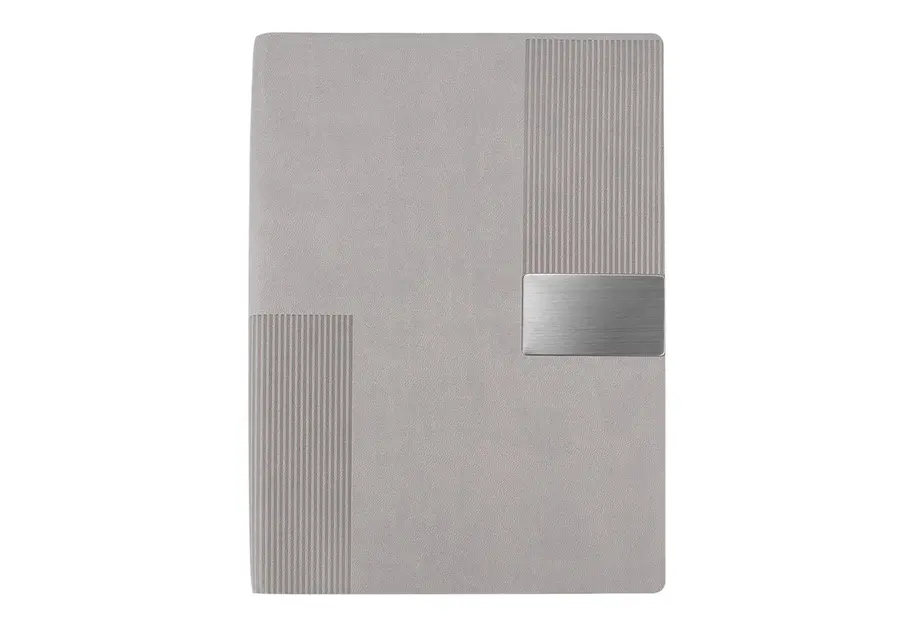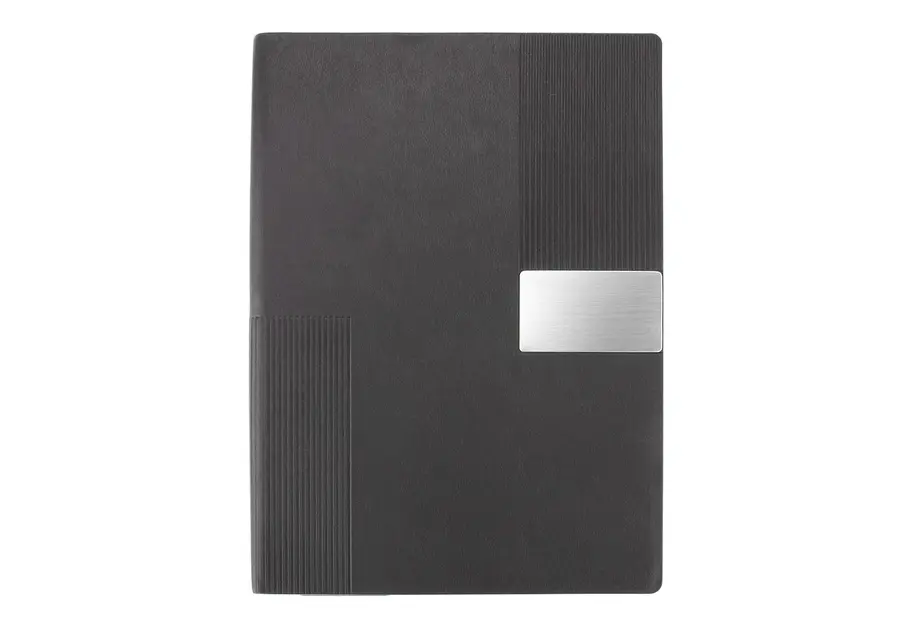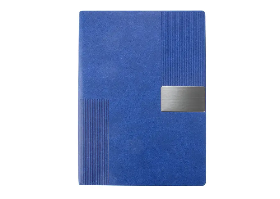 Libreta A5 con cubierta de PU suave al tacto, con elegante patrón en relieve y placa metálica decorativa con protector. Contiene 80 hojas rayadas de papel reciclado, ideales para escritura cómoda y organizada. Incluye cinta separadora para marcar tus páginas importantes. Su diseño moderno y profesional la convierte en una excelente opción para uso personal o corporativo.