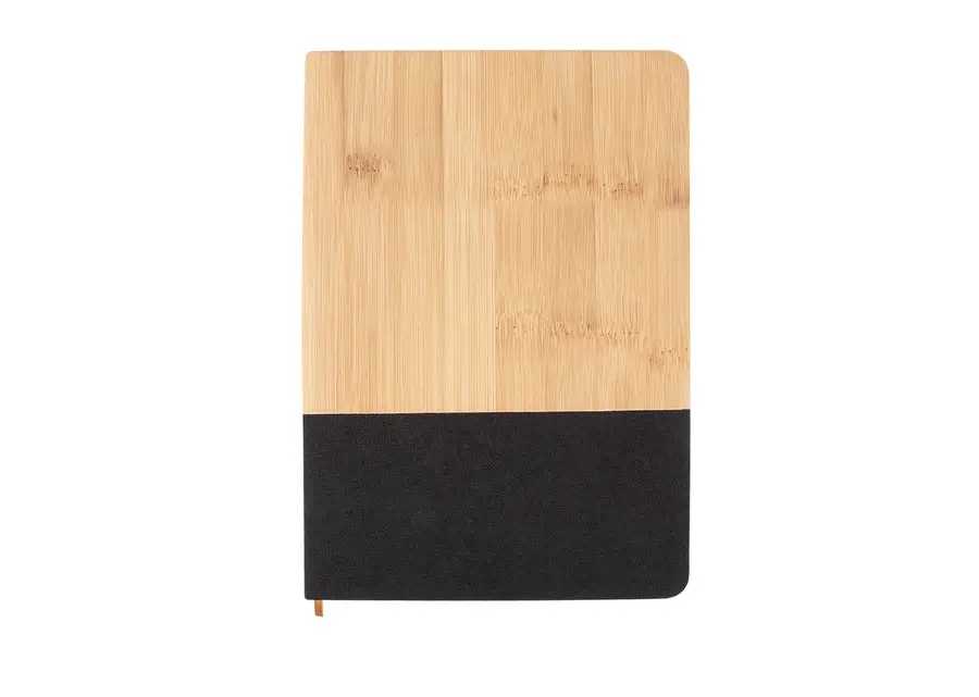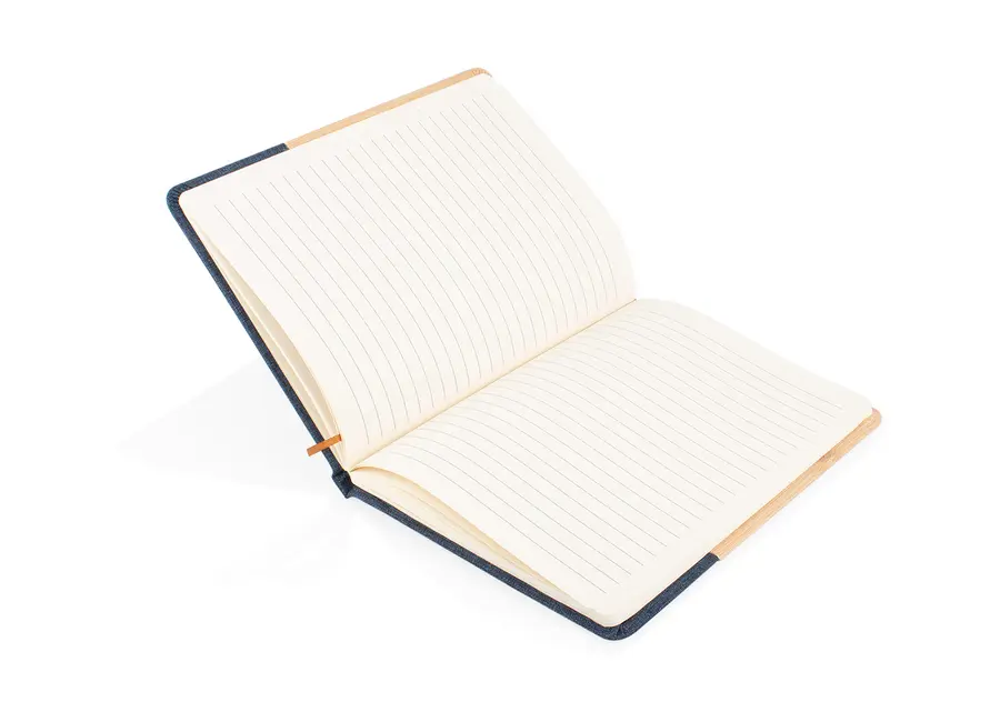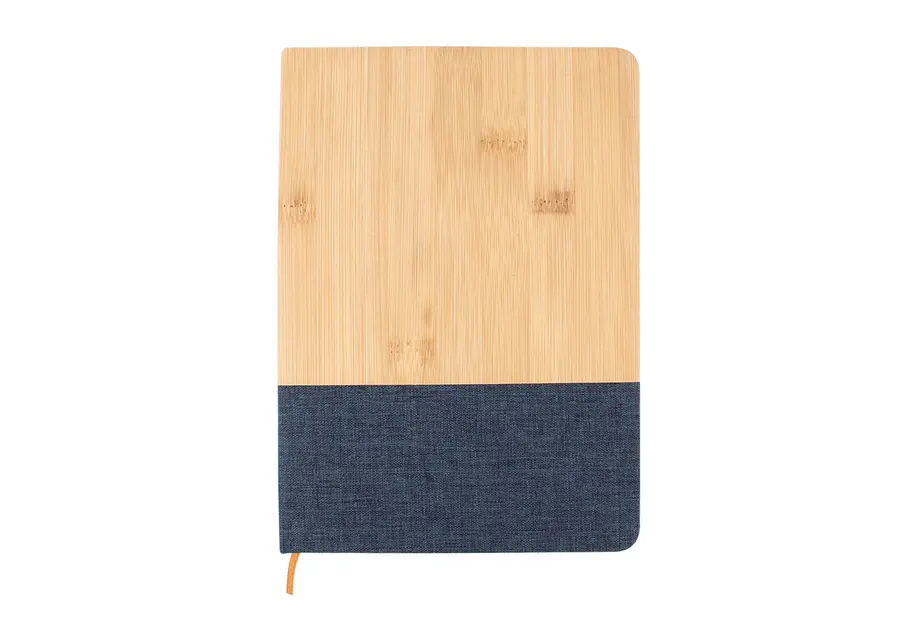 Agenda elegante y funcional en formato A5, elaborada con una combinación de PU y RPET que incorpora un atractivo patrón tipo bambú para un diseño moderno y sostenible. Incluye 80 hojas rayadas de papel de 70 g/m², ideales para tomar notas con comodidad, y una práctica cinta separadora que facilita la organización.