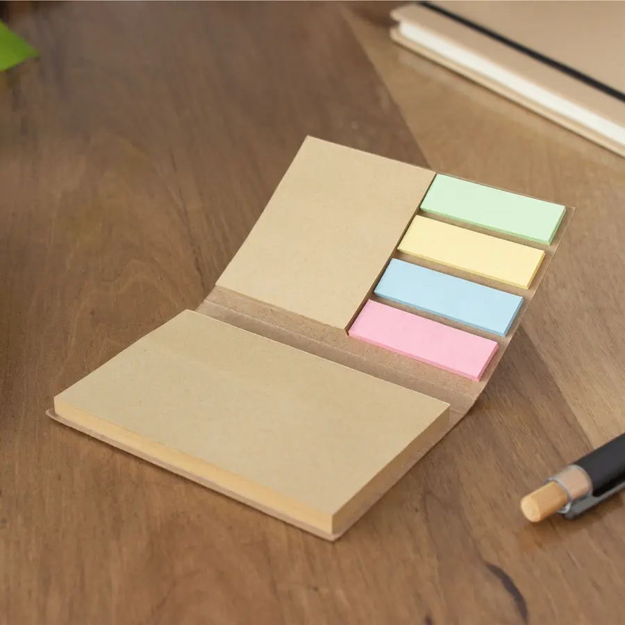 10 x 7 cm. Cartón y Papel. Bloc de notas autoadhesivas. Cubierta de 300 grms. Incluye: 50 hojas kraft de 9,5 x 6 cm., 25 hojas kraft de 5 x 6 cm y 5 blocs de 25 hojas en colores verde, amarillo, celeste y rosa de 4,5 x 1 cm.