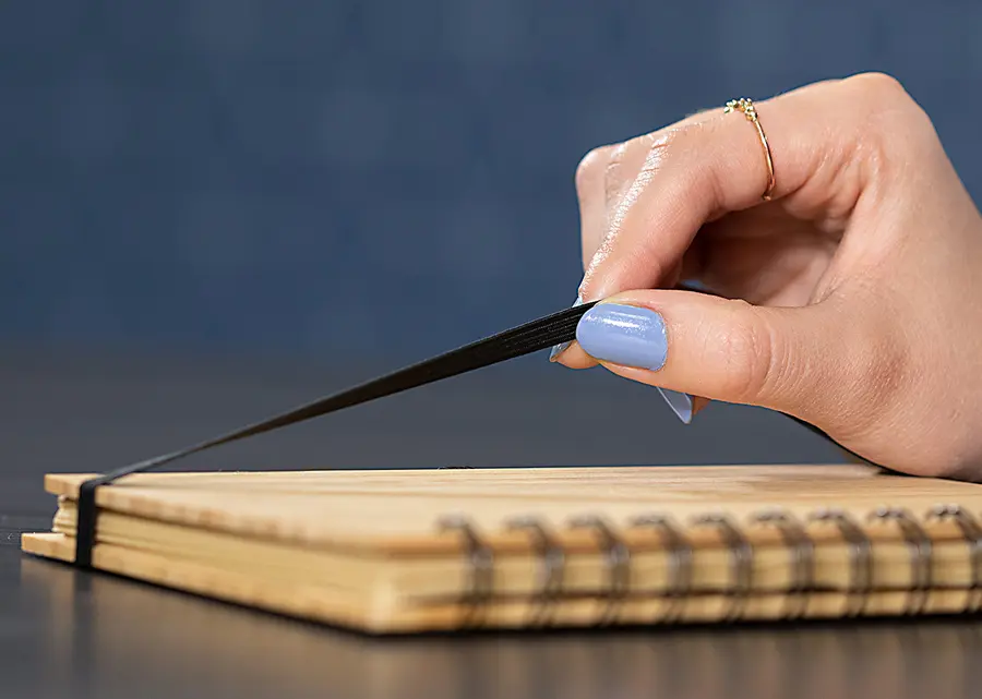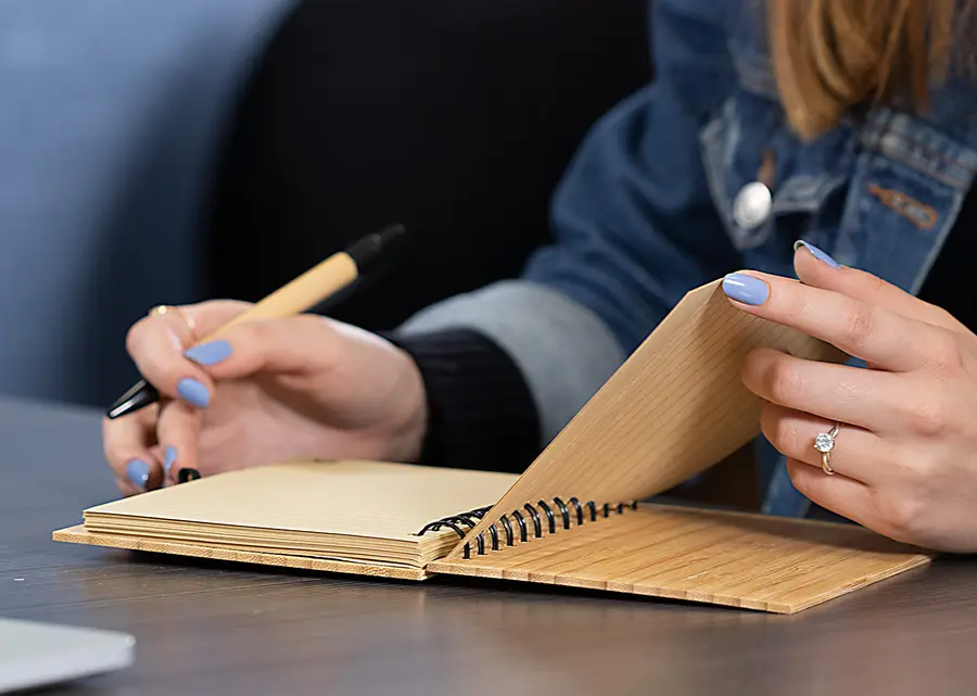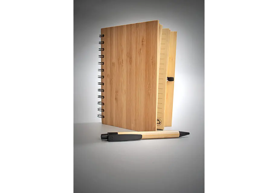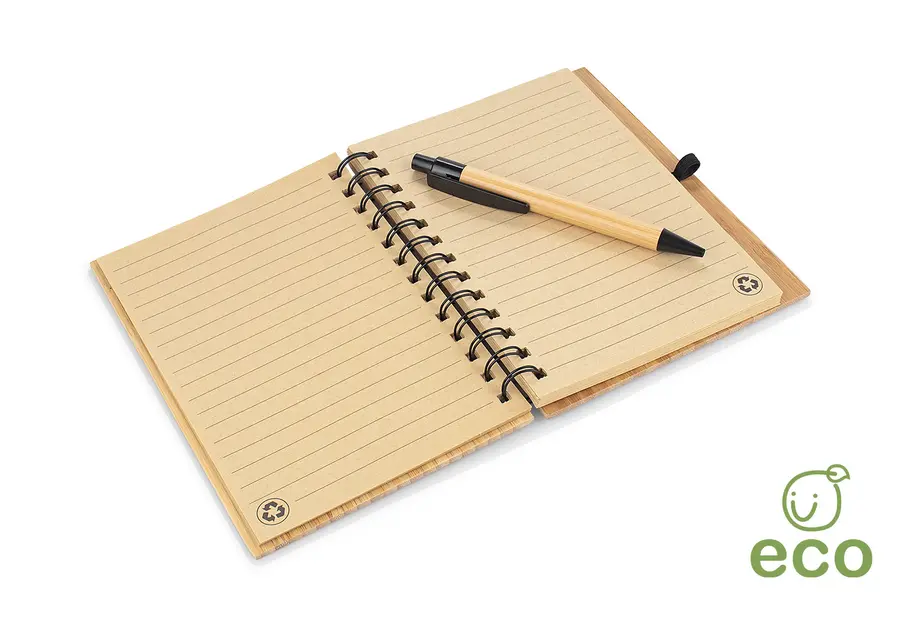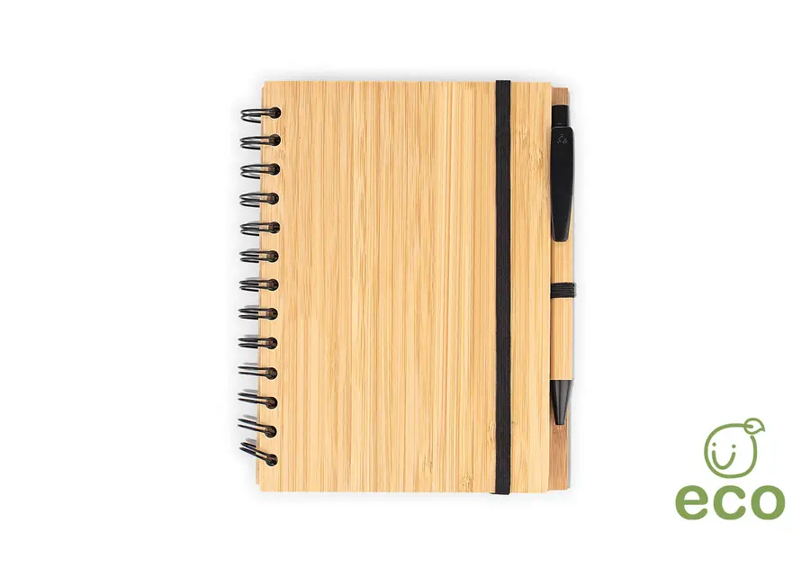 Cuaderno argollado doble O con Cubierta y bolígrafo en Bambú. 70 hojas rayadas en papel reciclado.Banda porta bolígrafo. Tamaño aproximado A5.