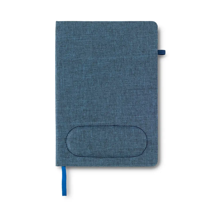Cubierta en poliéster, con mouse pad. Apoya muñecas ergonómico acolchado. 80 hojas de papel crema con rayas.