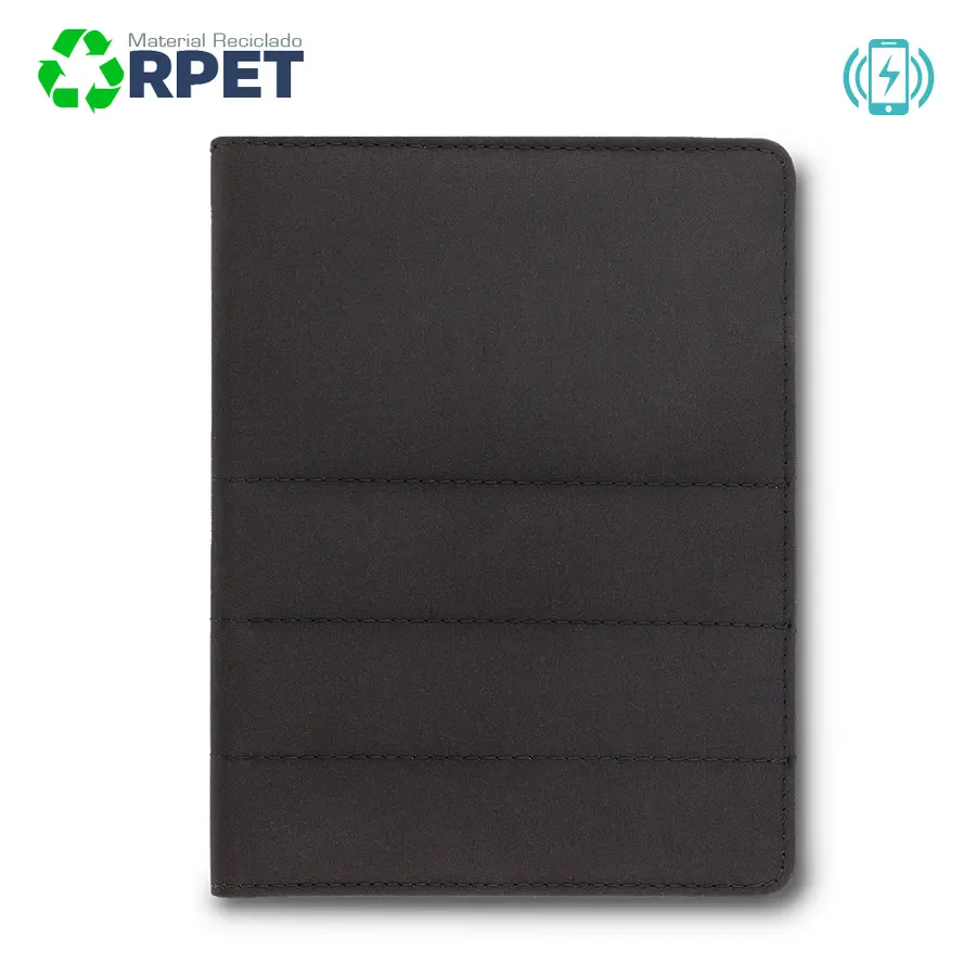 Libreta tamaño A5 de 60 hojas papel crema con rayas, con funda multifuncional elaborada en poliéster reciclado hecho a partir de la reutilización de botellas plásticas, un bolsillo, portatarjetas y bloc de notas. Incluye cargador inalámbrico de 5W (funciona siempre conectado), no incluye bolígrafo.