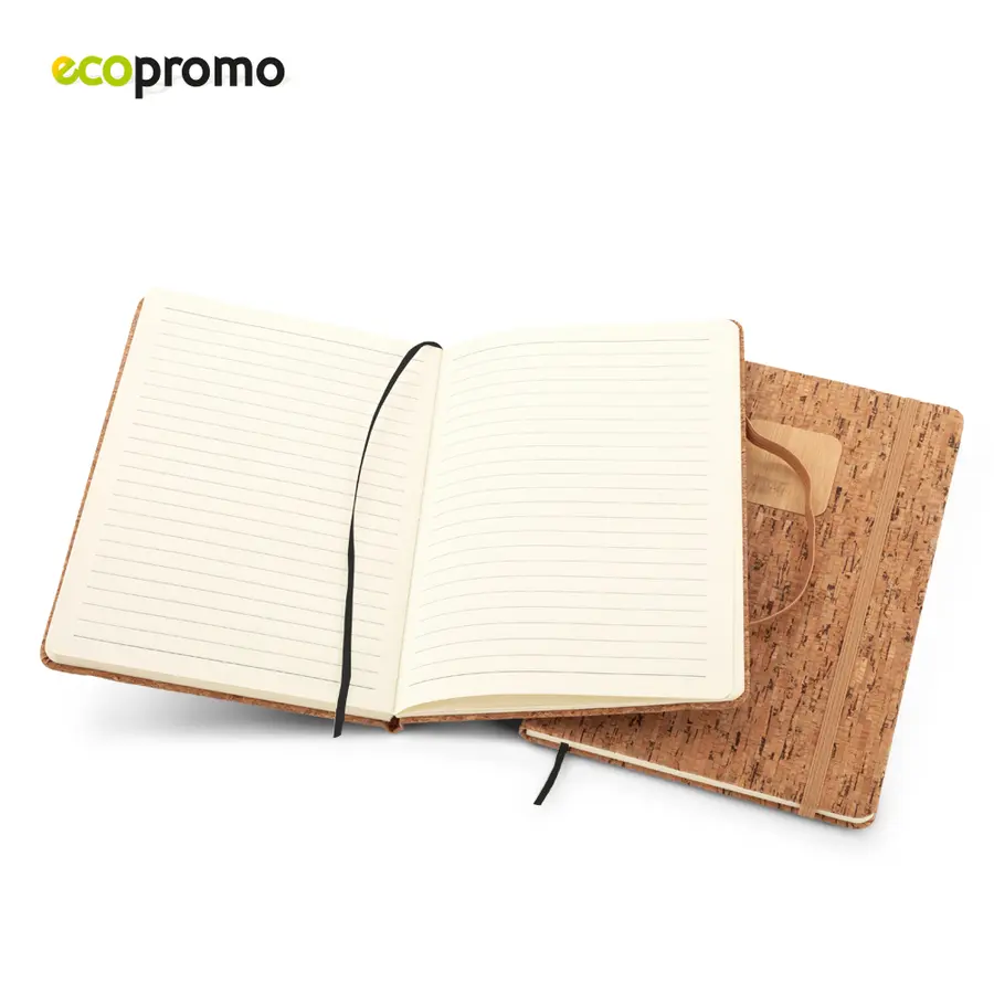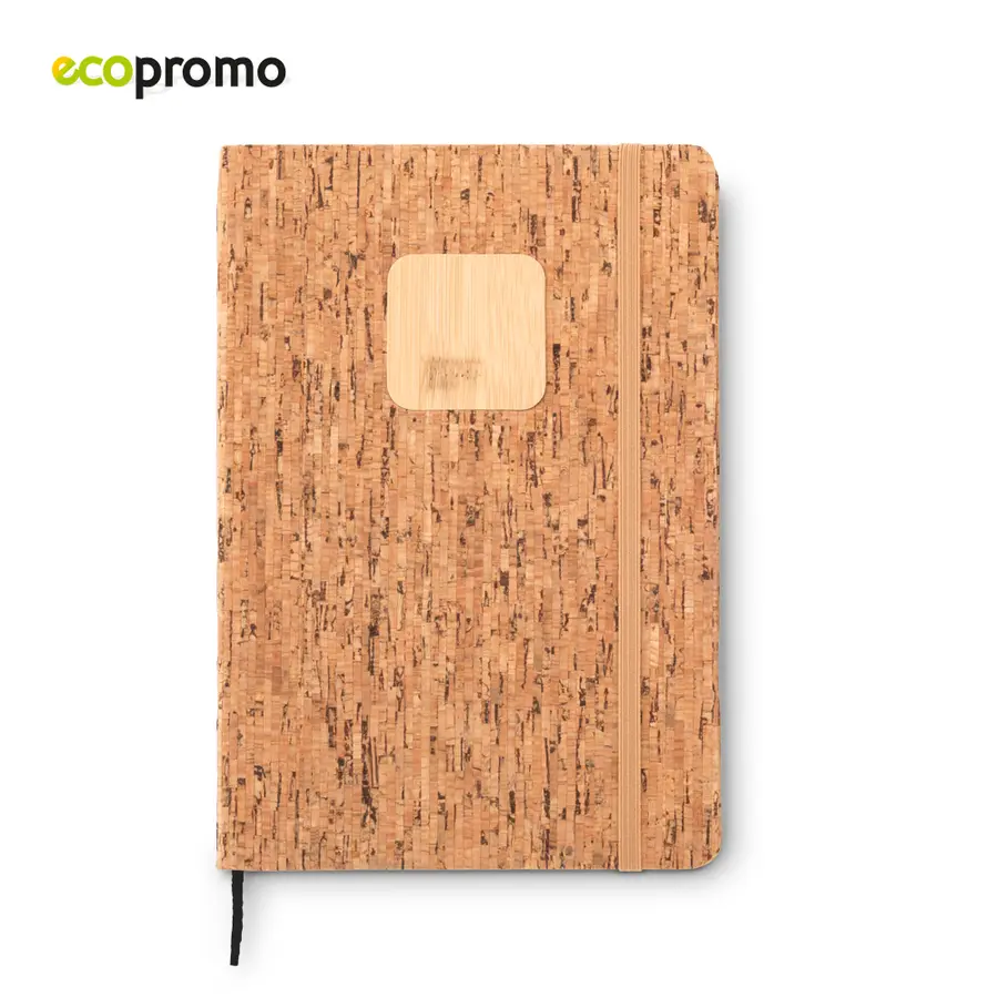 Libreta de 80 hojas de papel natural con rayas, cubierta en corcho con cierre elástico y placa en bambú.