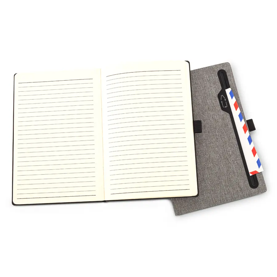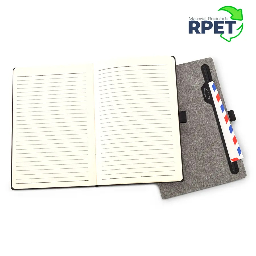 Libreta en poliéster reciclado RPET, con bolsillo exterior sin cierre. 80 hojas rayadas color crema.