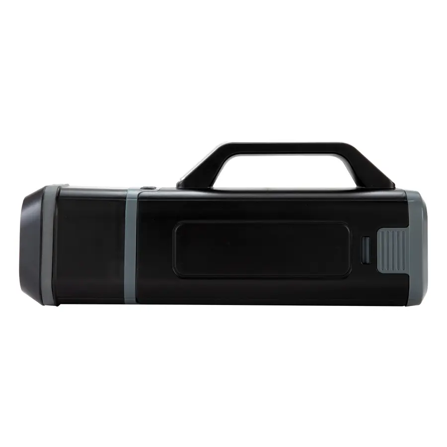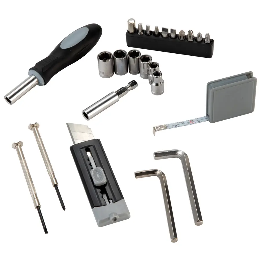 Tu aliada ideal para cualquier lugar y momento.Linterna con set de herramientas. Batería de litio recargable. El set incluye: 2 llaves allen hexagonales de 4 y 6 mm., 1 cutter de hoja ancha, 1 cinta métrica de 1m., 2 destornilladores de precisión (punta plana y phillips), 1 mango de destornillador, 1 barra de extensión, 1 conector, 9 puntas de destornillador (2 planas, 3 phillips y 3 torx), 6 llaves de tubo (5 a 10 mm.) y 1 cable de carga color blanco. Medidas: 24 x 10 x 7,8 cm. Materiales: ABS y acero al carbono. Capacidad batería: 800 mAh Peso: 650 g Presentación: en caja de regalo kraft