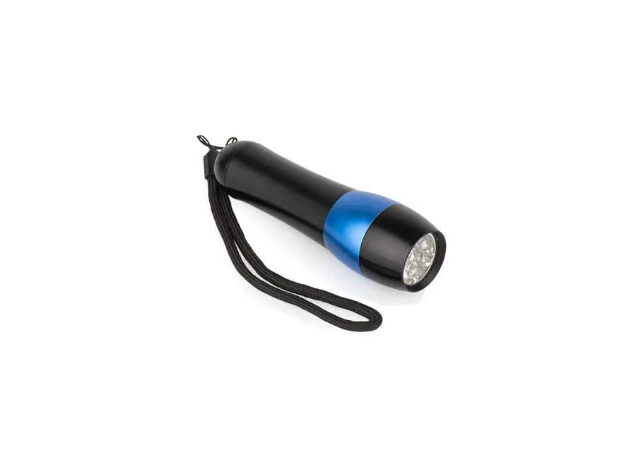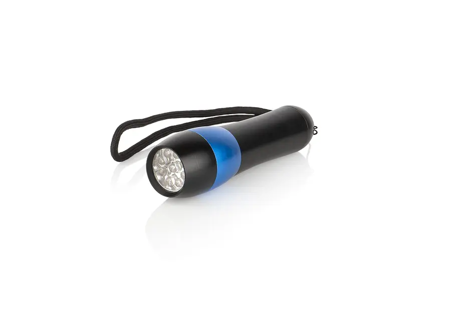 Linterna de aluminio con 9 LEDs. Requiere 3 pilas AAA (no incluidas). Correa negra para transportar fácilmente.