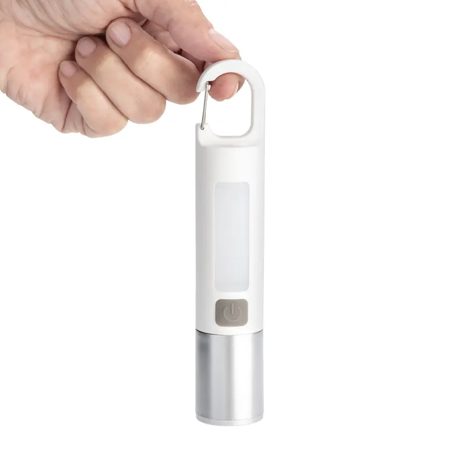 Luz potente siempre a tu alcance.Linterna portátil recargable. Con mosquetón incorporado. Luz de emergencia y 2 intensidades de iluminación (alta e intermitente). Batería recargable 800 mAh. Fuente de luz 7 leds de alta potencia. Puerto USB-C oculto (se desplaza el cuerpo hacia arriba). Cable de carga color blanco. Medidas: Ø 3 cm x 15,8 cm. Materiales: Aluminio y ABS. Presentación: en caja de regalo kraft.