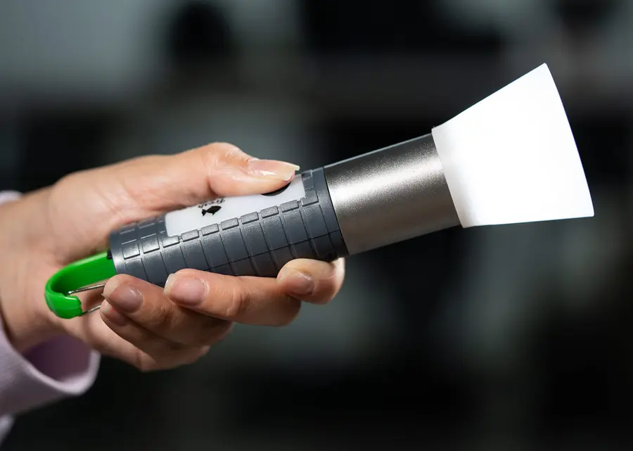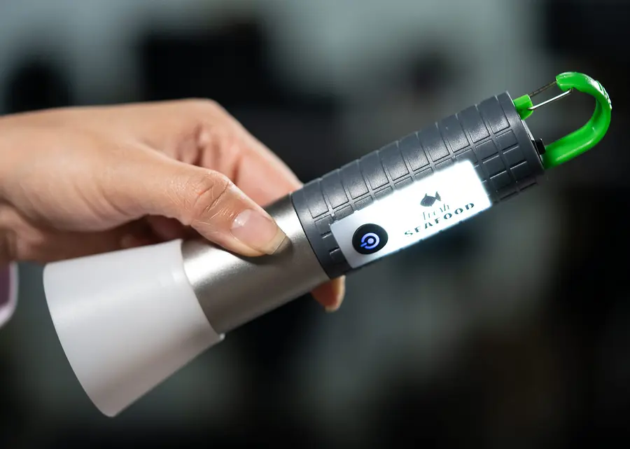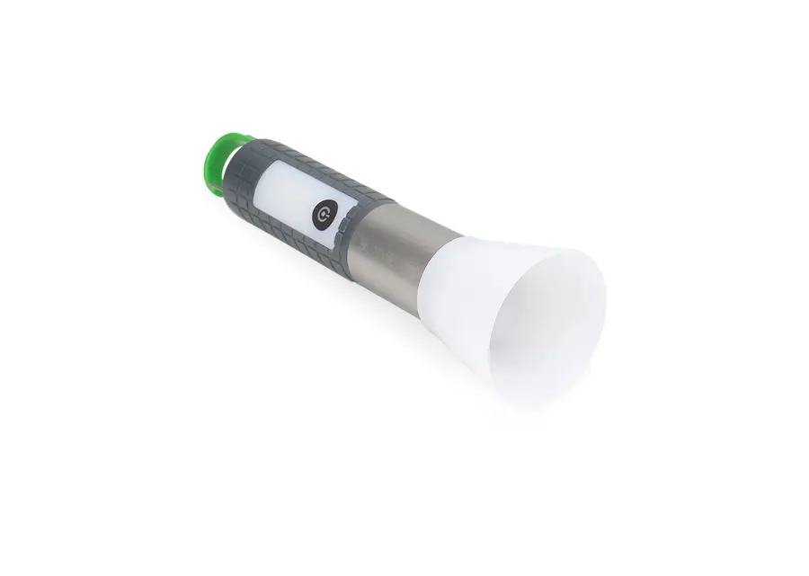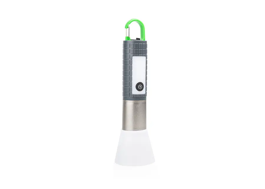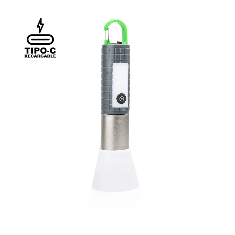 La Linterna COB posee distintos tipos de intensidad lumínica. Textura para mejor agarre y gancho carabinero para sujetar y transportar fácilmente, además, un puerto para carga tipo C en la parte inferior (incluye cable).