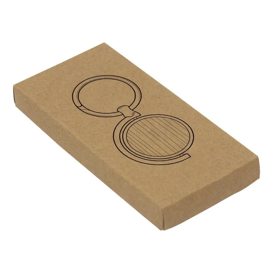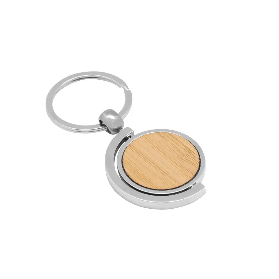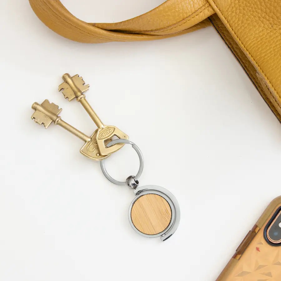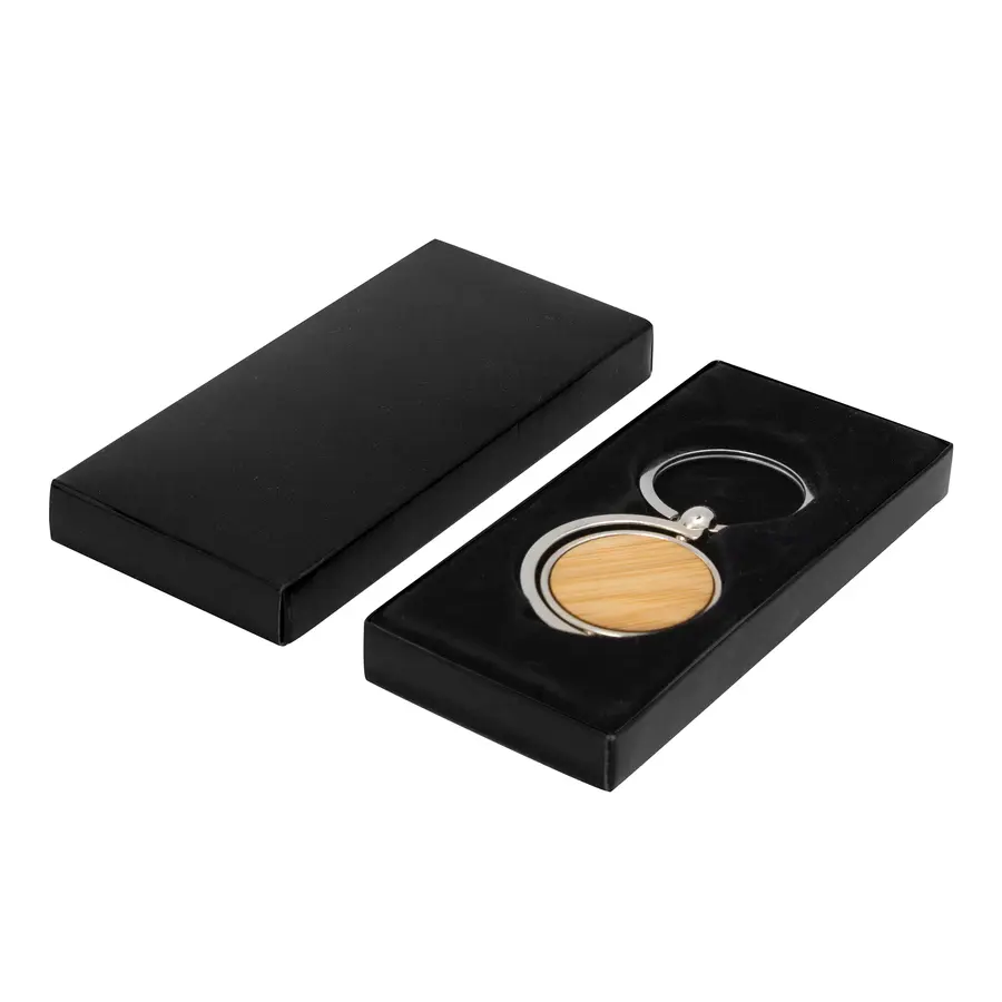 Llavero circular de bambú con detalles metálicos. Estructura giratoria 360°. Presentación en caja de regalo.