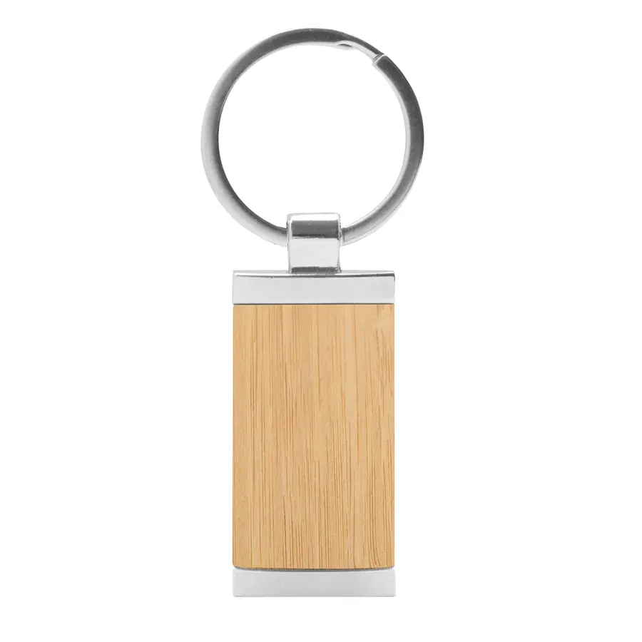 8,5 x 2,4 x 0,6 cm. Llavero rectangular de bambú con detalles metálicos. Presentación en caja de regalo.