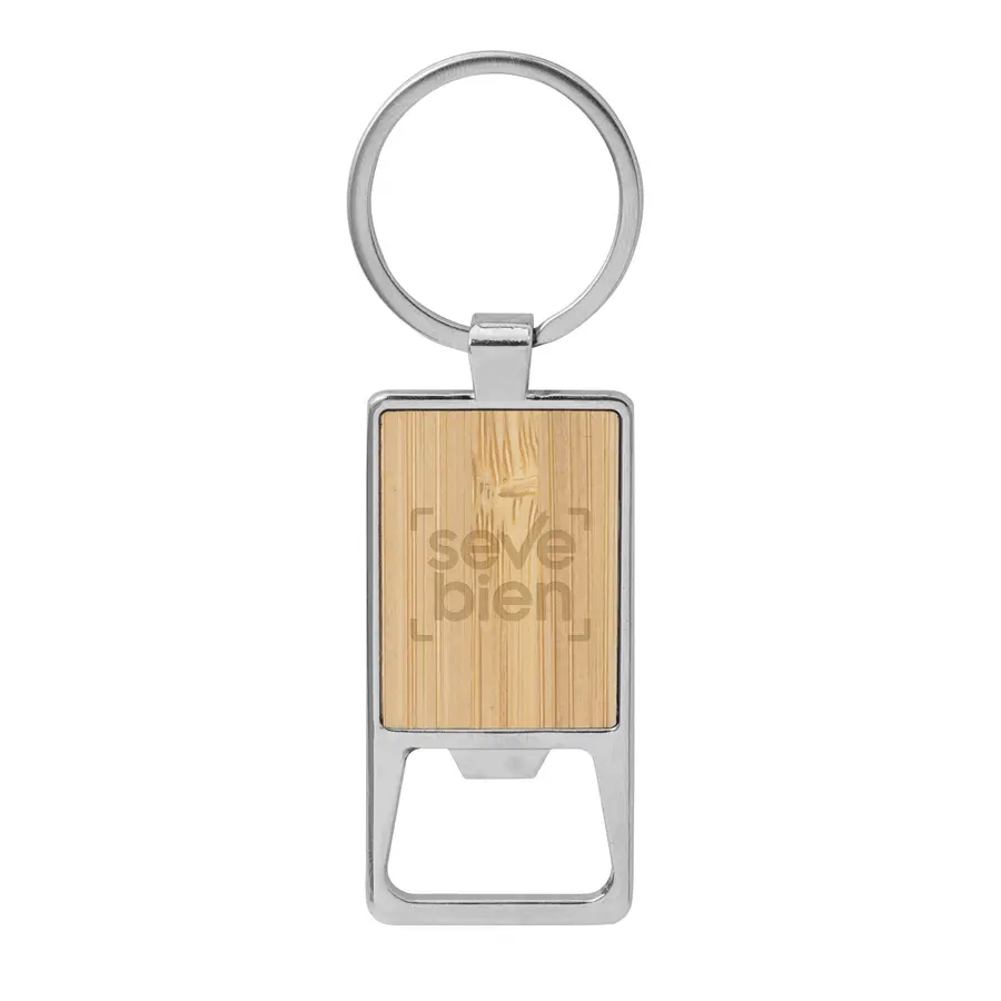 Funcionalidad y estilo.Llavero con destapador abre botellas. Estructura metálica con aleación de zinc con acabado brillante y panel frontal de bambú barnizadoMedidas: 6 x 3,2 x 3,5 cm. Materiales: Acero y Bambú. Presentación: en caja de regalo kraft con bandeja de terciopelo color negro.