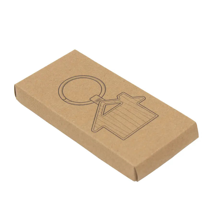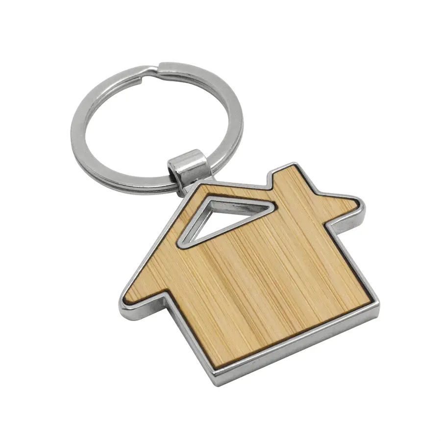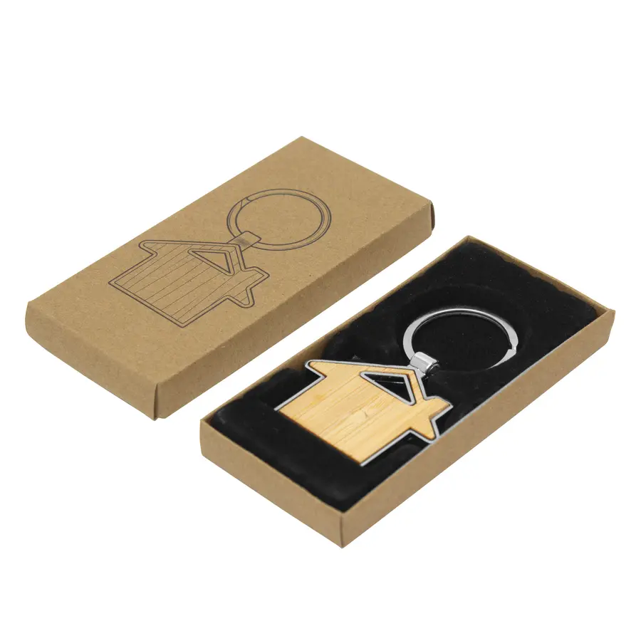 7,5 x 4,8 x 0,7 cm. Metal y Bambú. Llavero con forma de casa. Estructura metálica con aleación de zinc con acabado brillante y panel frontal de bambú barnizado. Presentación en caja de regalo kraft con bandeja de terciopelo color negro.
