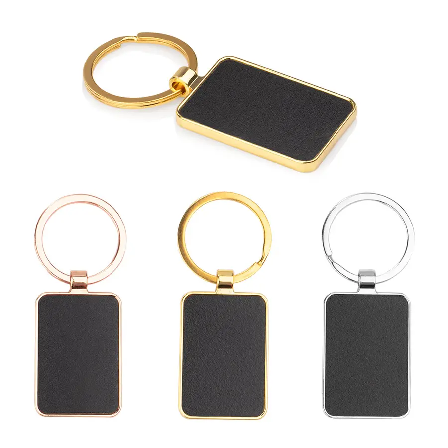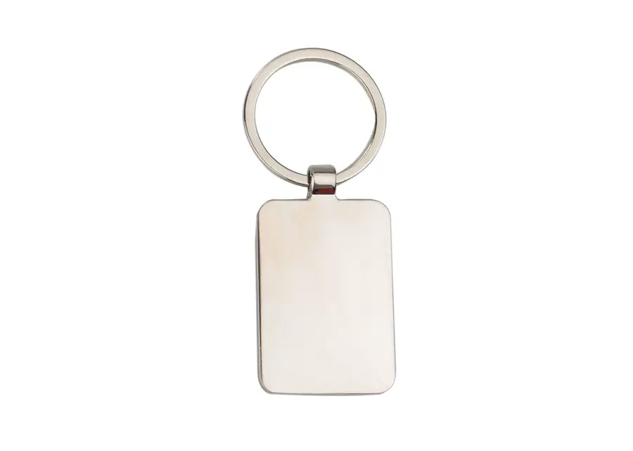 Llavero metálico rosa con forma rectangular. Superficie oscura para marcación.