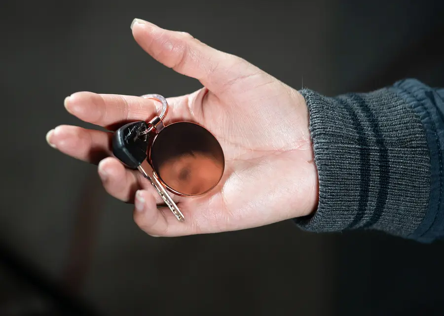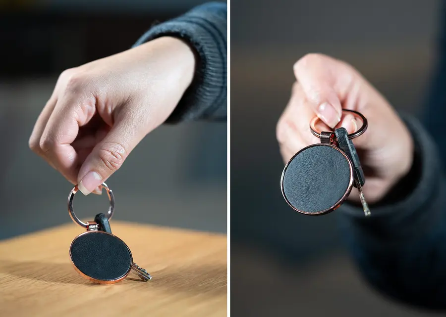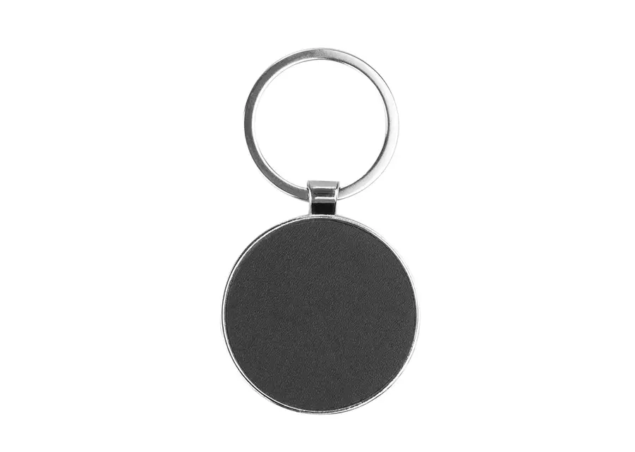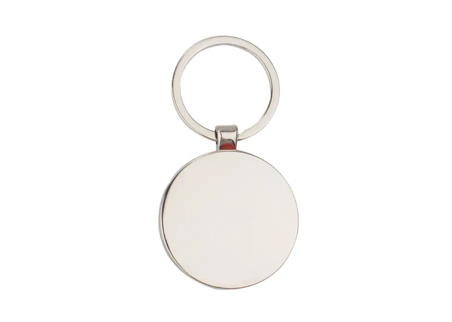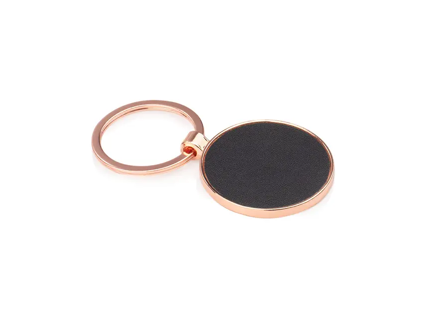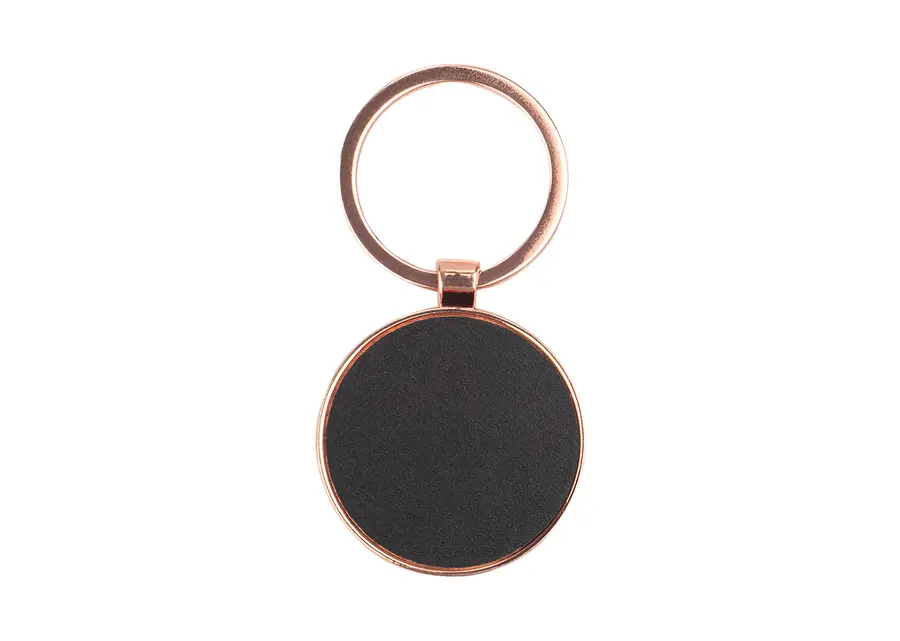 Llavero metálico rosa con forma redonda. Superficie oscura para marcación.