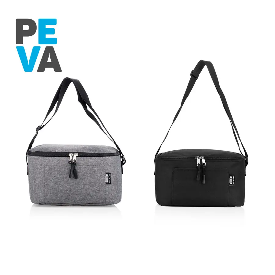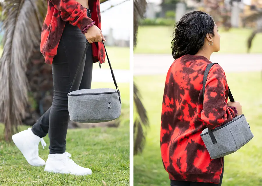 Lonchera con recubrimiento interno, diseño sofisticado, cierre de cremallera con doble deslizador y bolsillo pequeño en la parte frontal. Manija con hebilla para regular el largo del agarre.