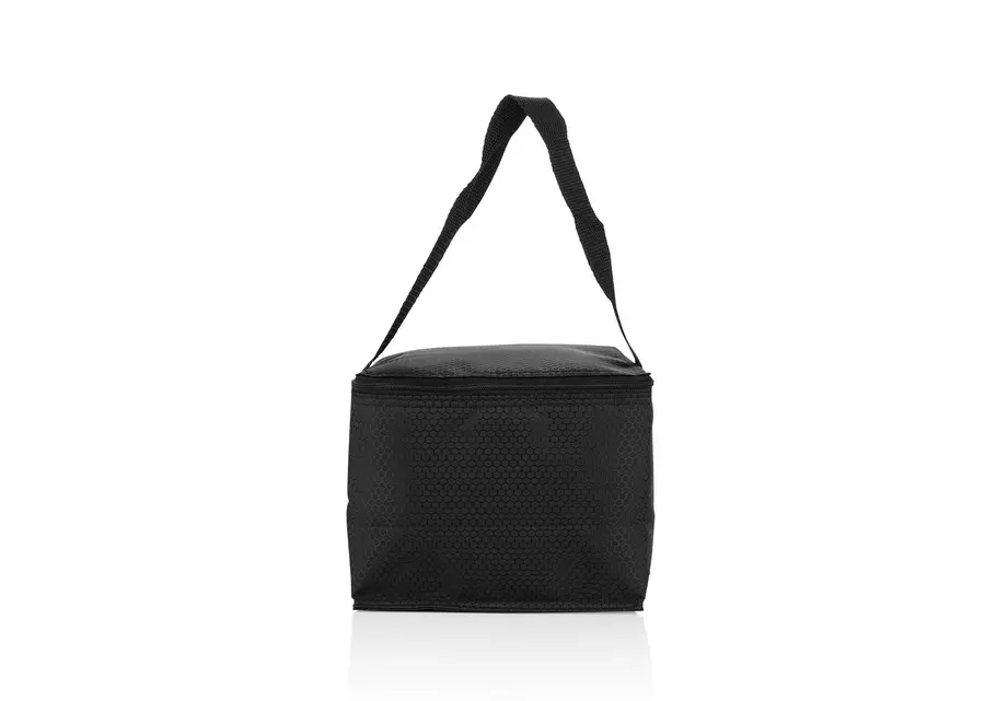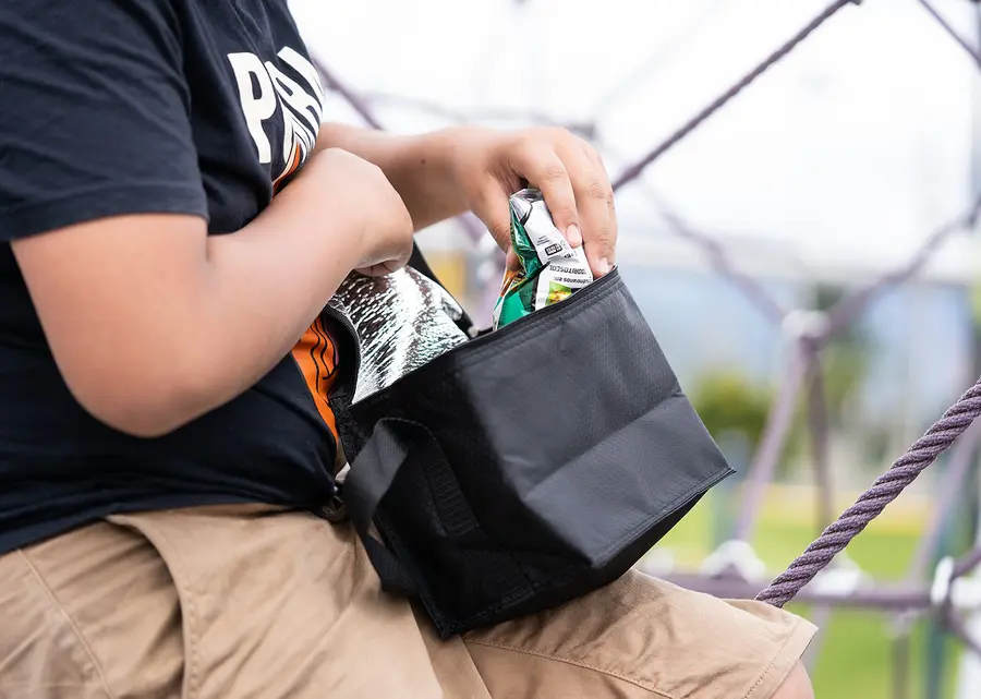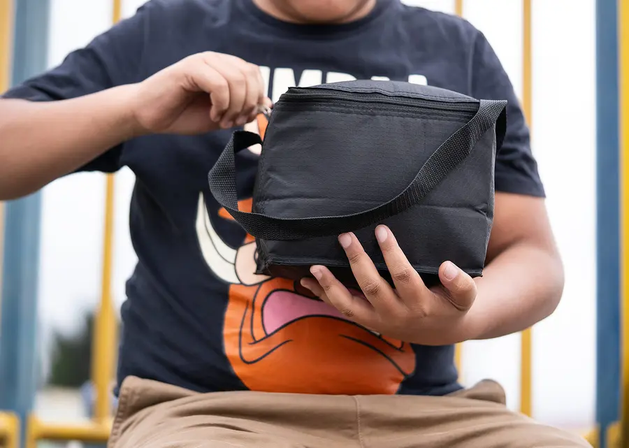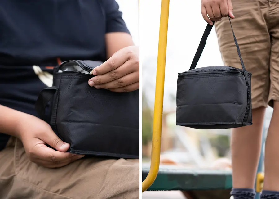 Lonchera con recubrimiento interior de aluminio para conservar la temperatura. Cierre de cremallera y cargadera de tela.