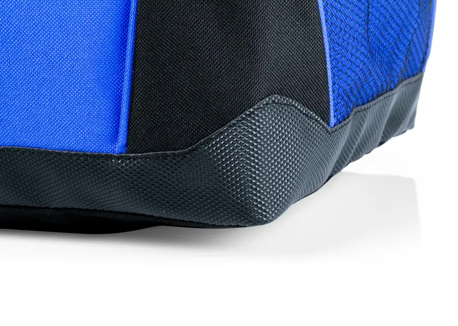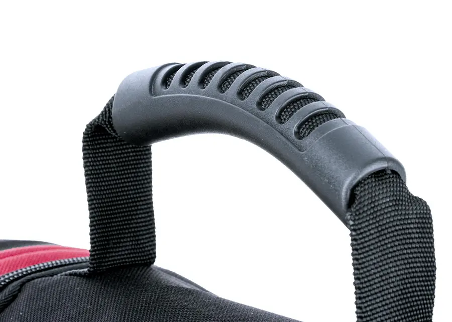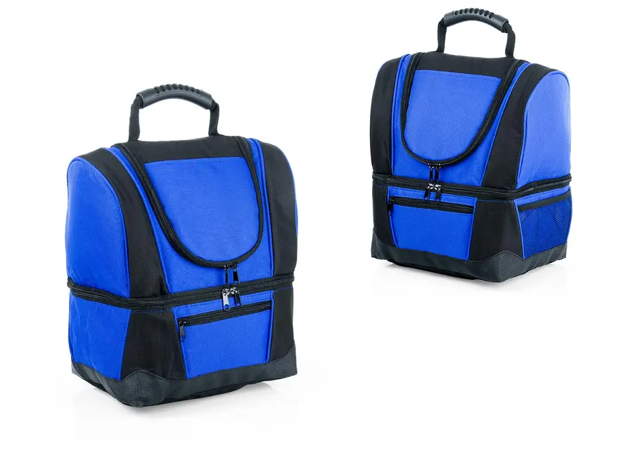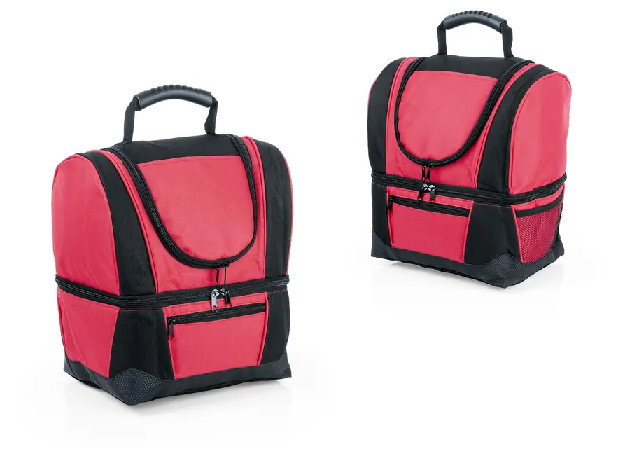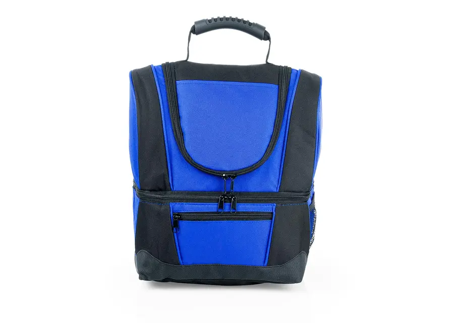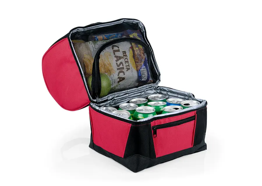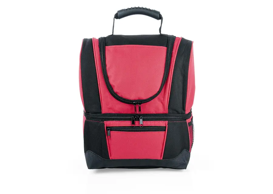 Lonchera de doble compartimiento con manija reforzada, recubrimiento interno y separador en malla de PVC, resistente a la humedad; al exterior bolsillo frontal con cremallera y bolsillo lateral libre en malla. El compartimiento posterior tiene capacidad para llevar hasta 12 latas de bebidas.