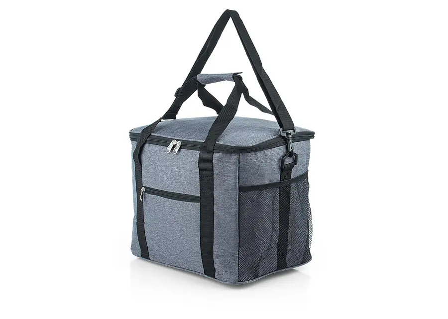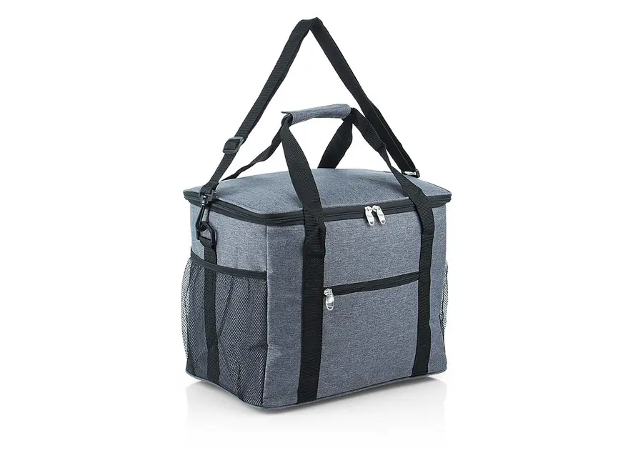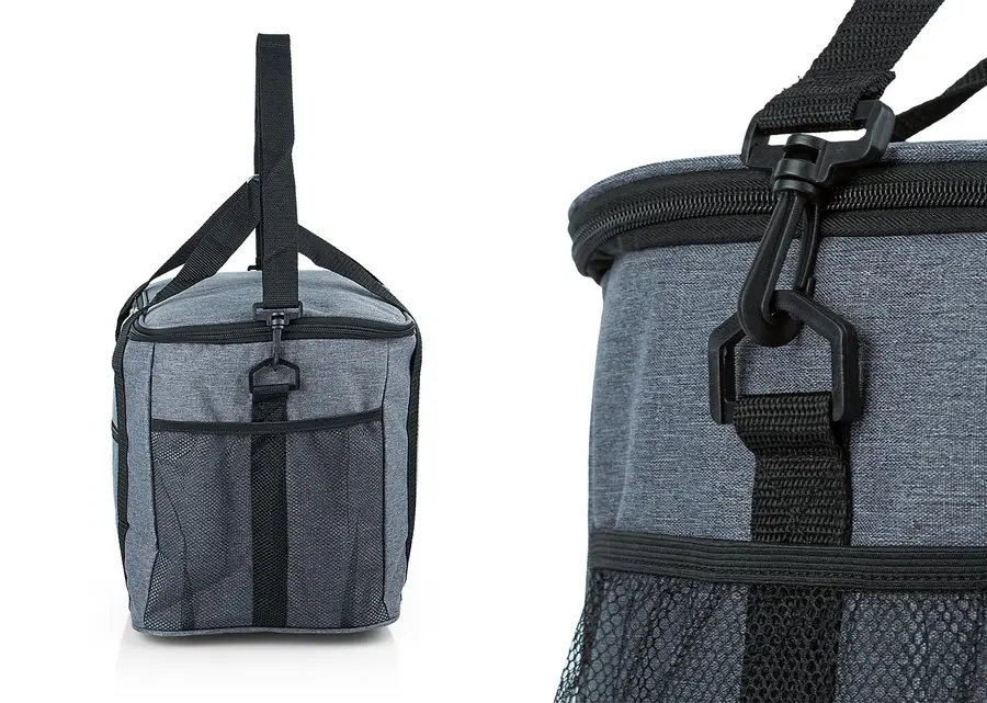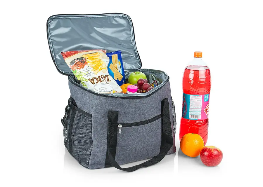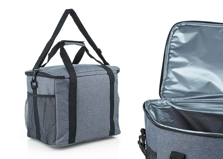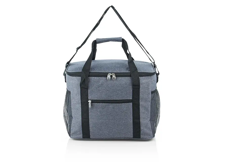 Lonchera térmica con recubrimiento interior en PEVA que conserva las bebidas o alimentos fríos por más tiempo, bolsillo principal y frontal con cierre en cremallera y bolsillos laterales en malla. Con práctica agarradera de mano y cargadera larga ajustable.