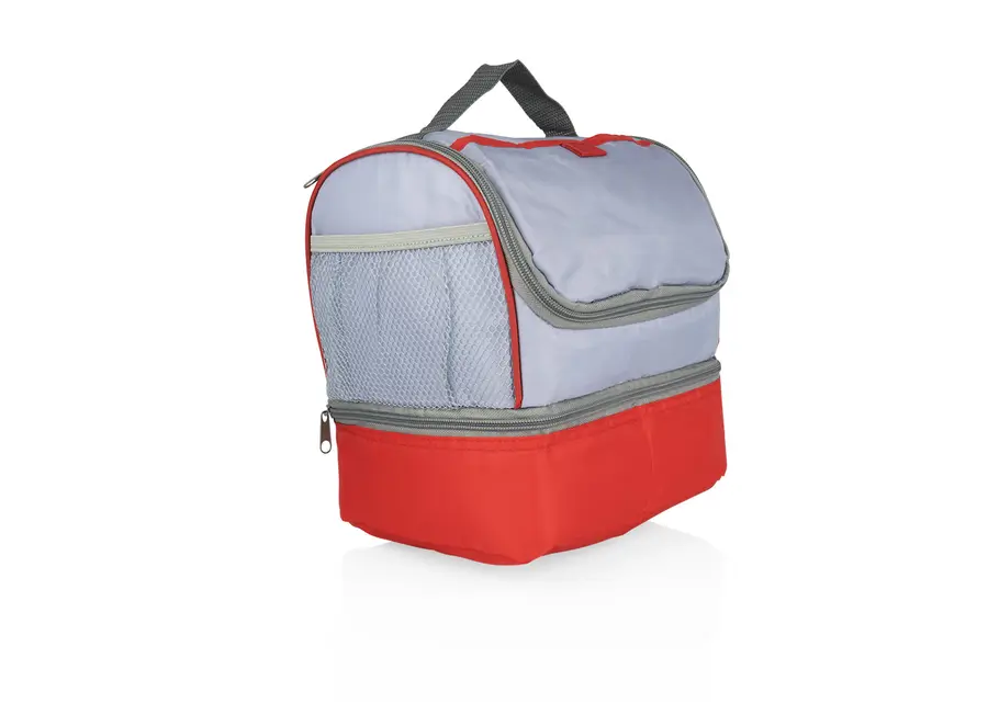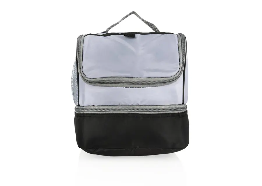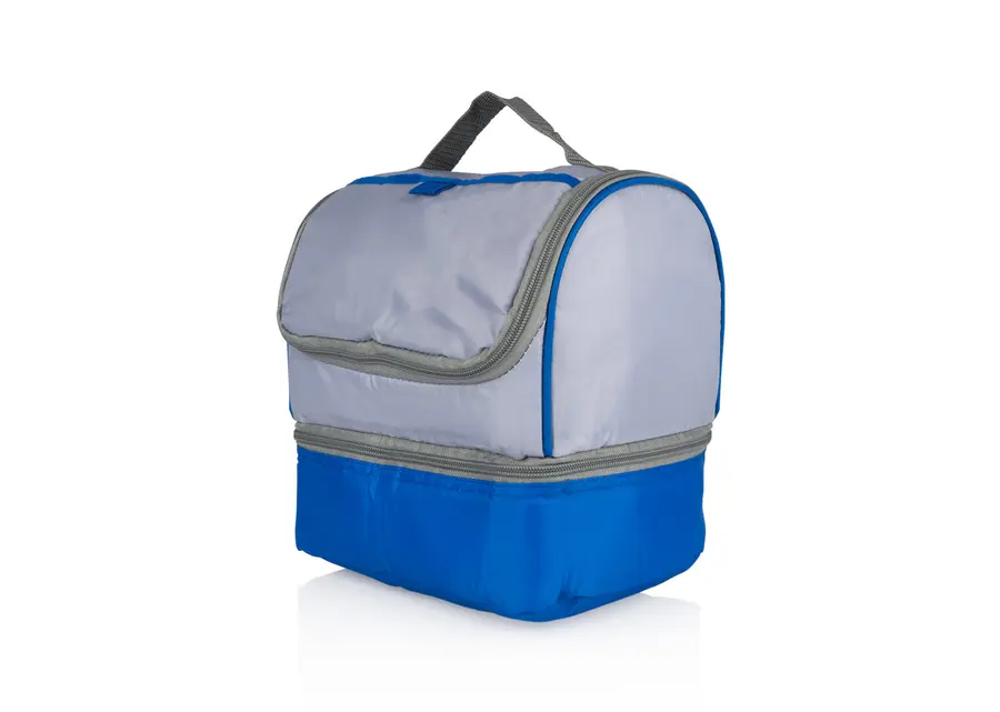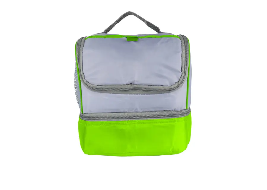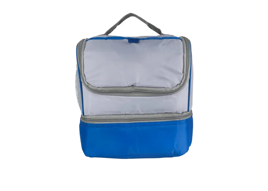 Lonchera de doble compartimento con manija reforzada y recubrimiento interno en PEVA que no es nocivo para la salud, además, es resistente a la humedad.