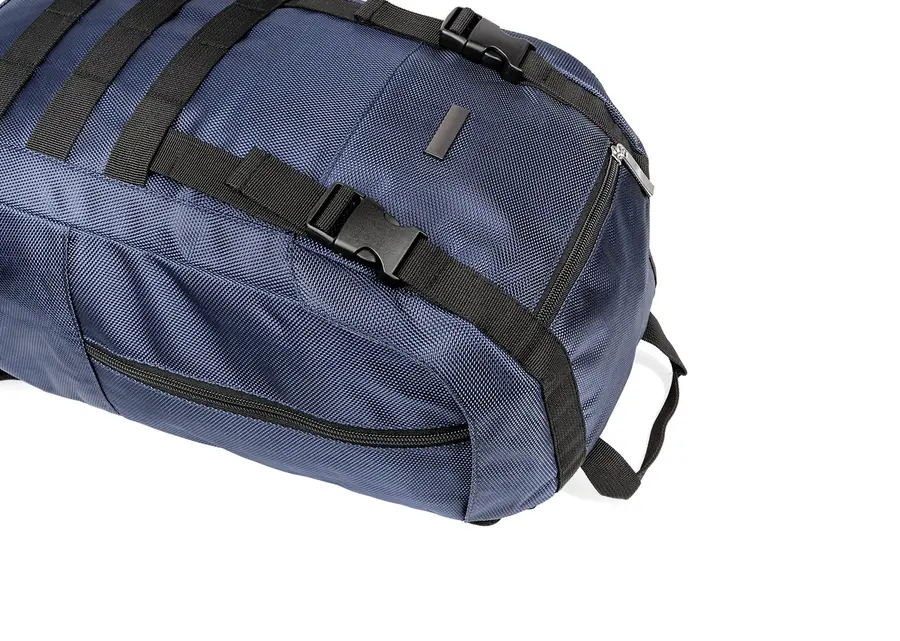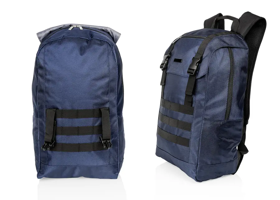 Morral para laptop con espaldar ergonómico y cargaderas ajustables y acolchadas. Cuenta con un bolsillo frontal, dos bolsillos medianos con compartimentos especiales en el interior y un bolsillo principal con un compartimento para dispositivos portátiles de 15″. Además, tiene dos bolsillos laterales de malla. Incluye una placa metálica para marca láser.