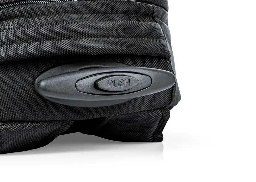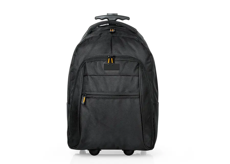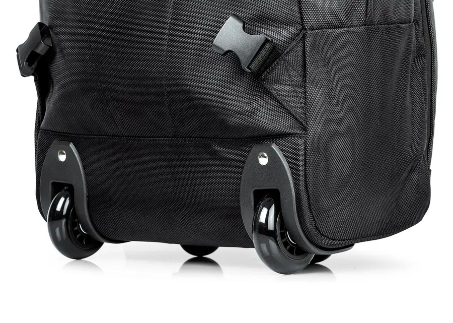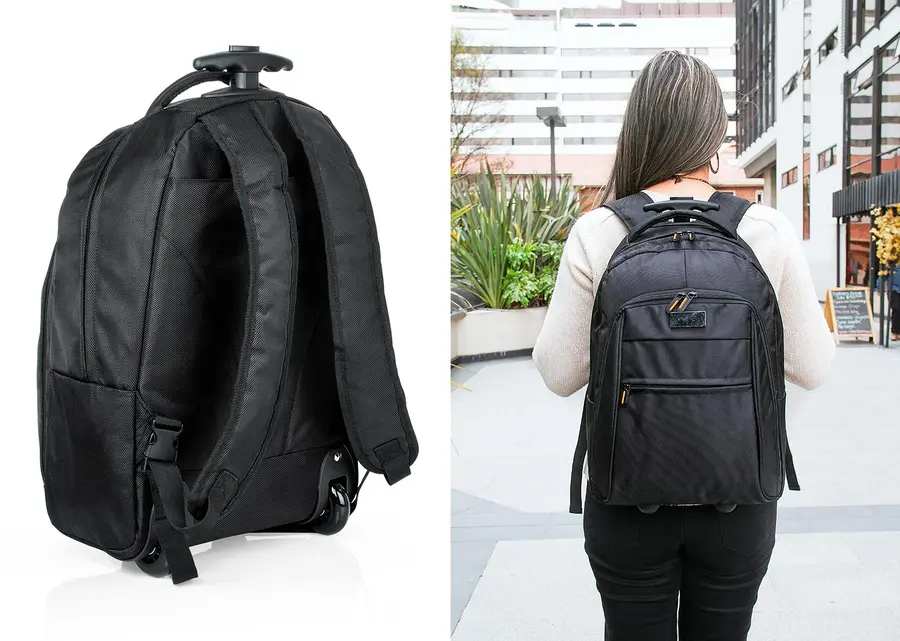 Morral para viaje con trolley. Cargaderas acolchadas ajustables y manija de mano. Bolsillo posterior con cierre de velcro. Dos bolsillos frontales con cierre de cremallera, uno de ellos con compartimentos, 4 bolsillos especiales para documentos y dos porta bolígrafos. Compartimiento principal con bolsillo acolchado especial para portátil hasta de 19 con cierre de velcro.