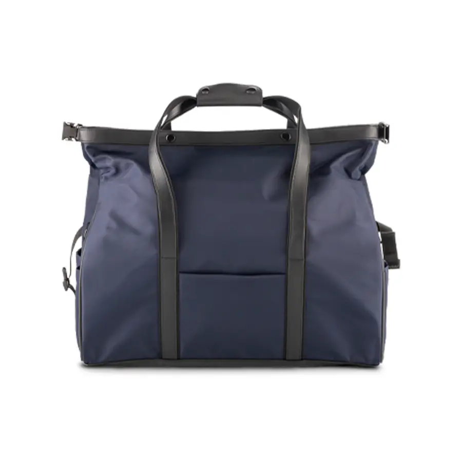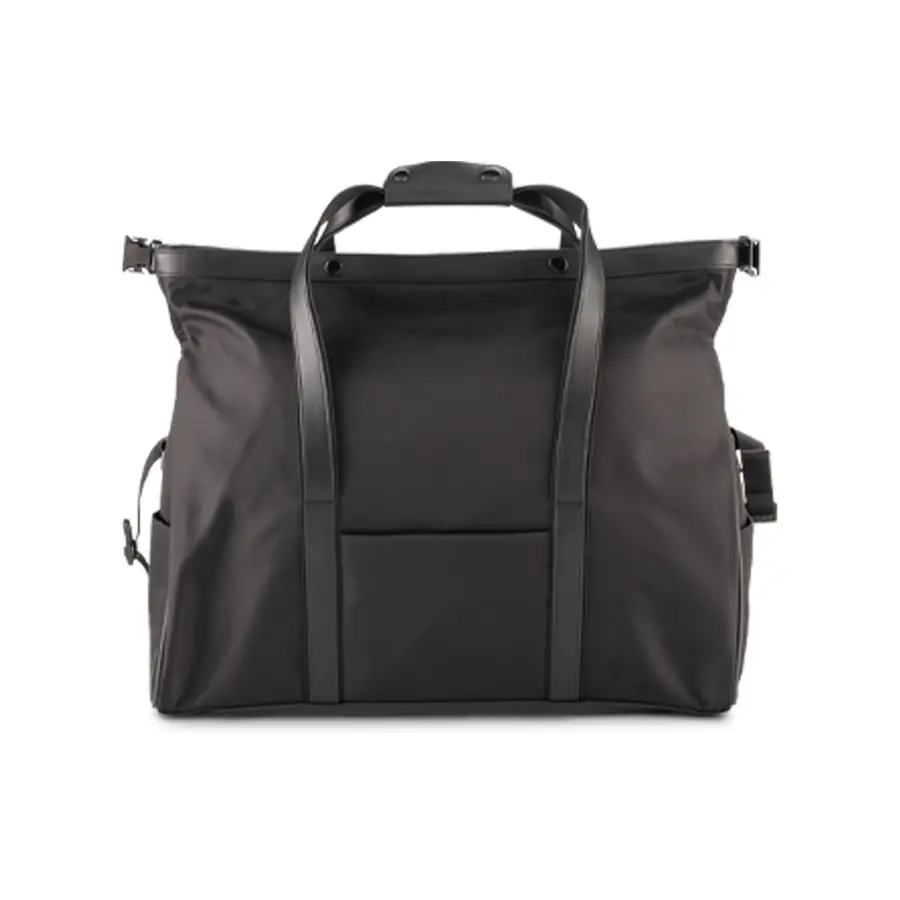 Maletín para viaje en nylon y correas cubiertas en imitación cuero. Un bolsillo frontal con botón de seguridad. Dos bolsillos laterales con botón de seguridad. Dos botones de seguridad y dos hebillas para el bolsillo principal. Banda posterior para enganc