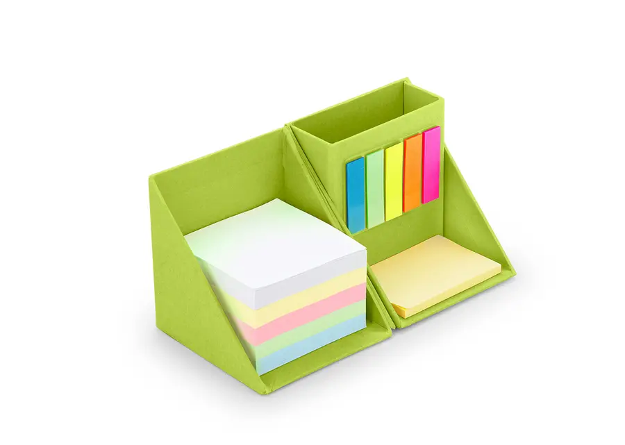 Set en forma de cubo con espacio para las tarjetas ó bolígrafos. Contiene: Taco de 5 colores de 100 hojas cada color, 1 set de memos amarillos de 50 hojas y 5 tacos de banderitas PET adhesivas en diferentes colores, de 25 hojas c/u.