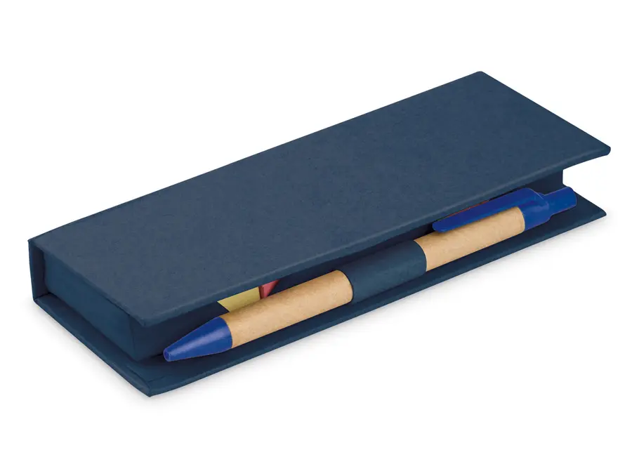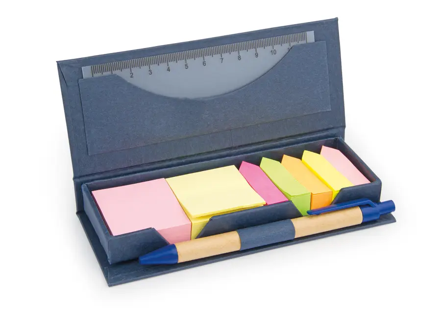 Estuche de cartón con bolsillo para regla de 12 cm, 2 memos de color con 110 hojas c/u y 5 banderas adhesivas en papel de diferentes colores. Incluye bolígrafo ecológico y porta bolígrafo.