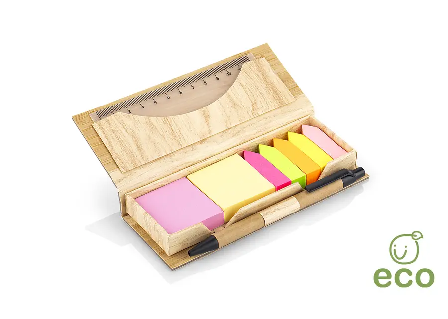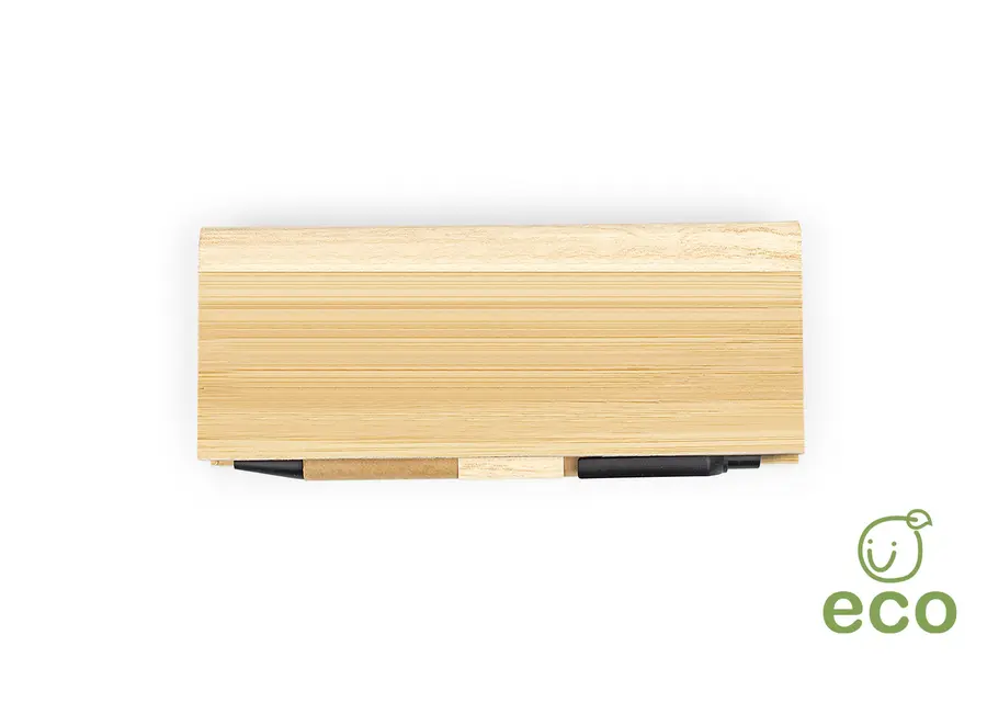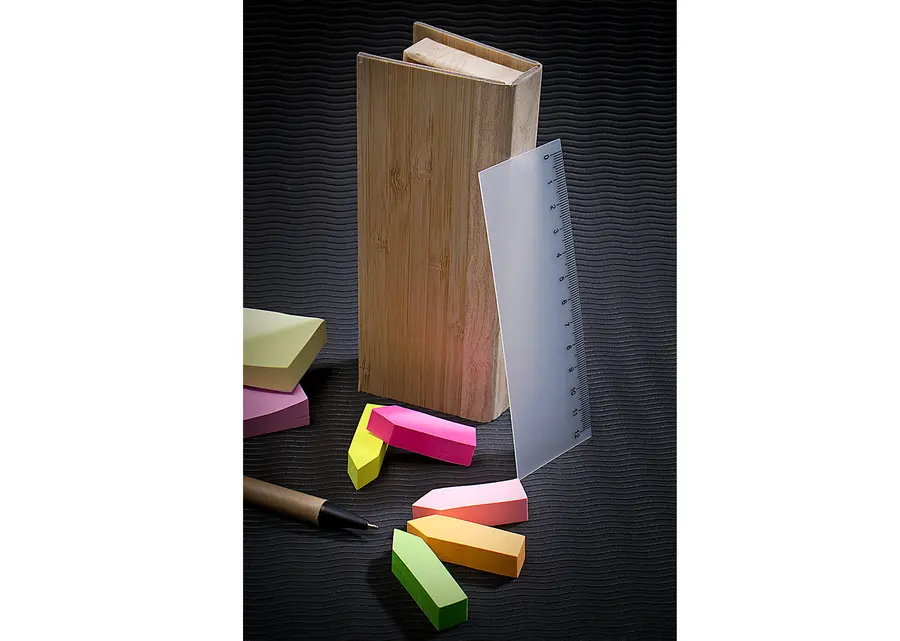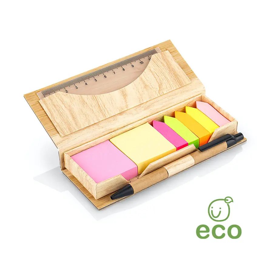 Estuche de Bambú con bolsillo para regla de 12 cm, 2 memos de color con 110 hojas c/u y 5 banderas adhesivas en papel de diferentes colores. Incluye bolígrafo ecológico y porta bolígrafo.