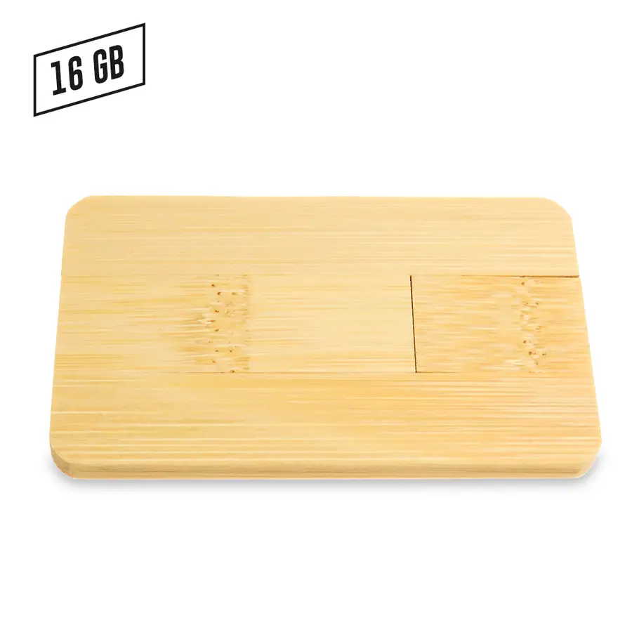 Memoria USB tarjeta de línea nature. 16GB de capacidad. De diseño plano, en bambú procedente de cortes naturales. Empaque caja individual.