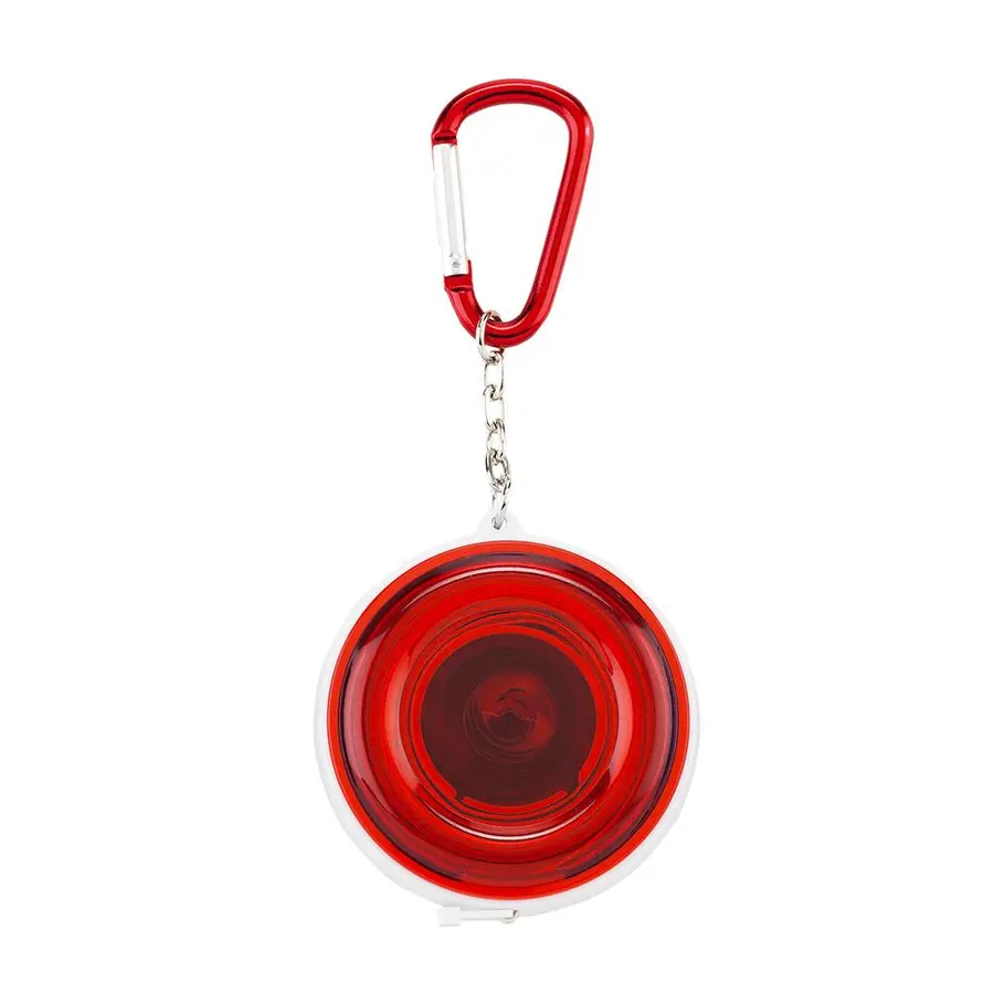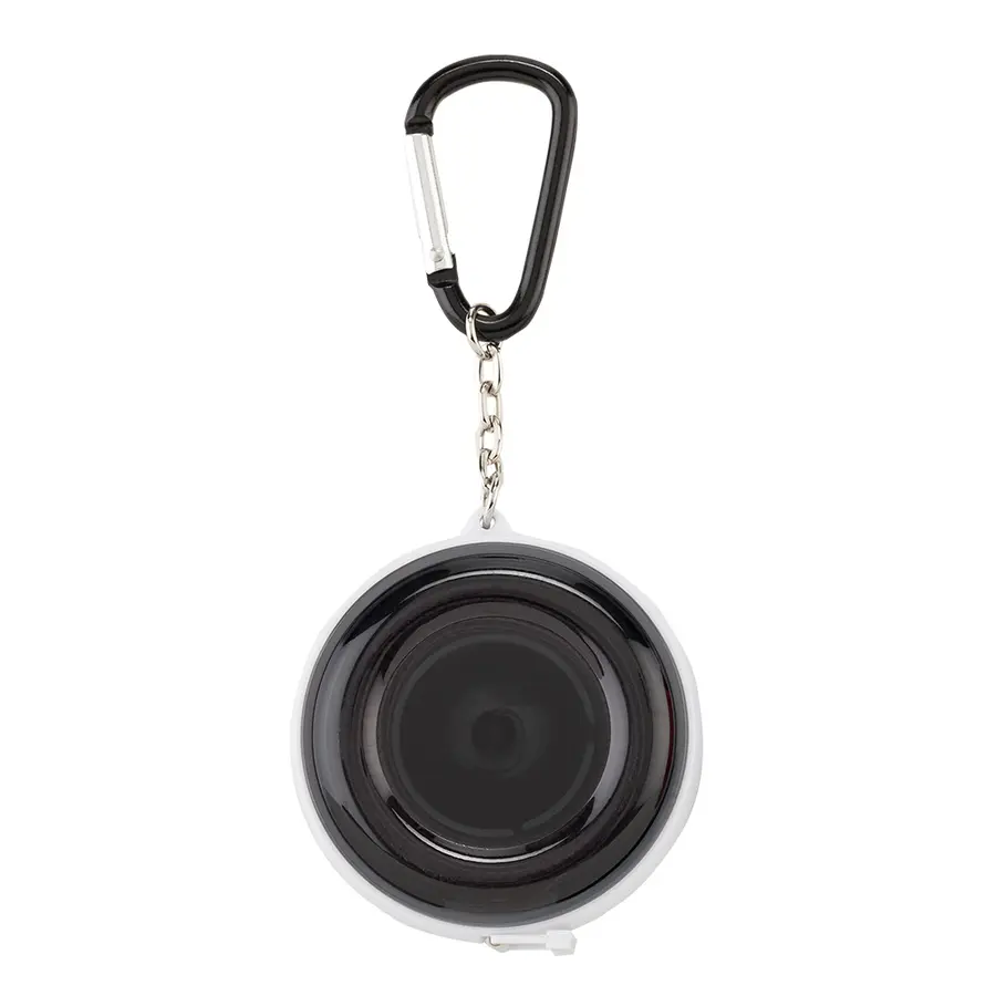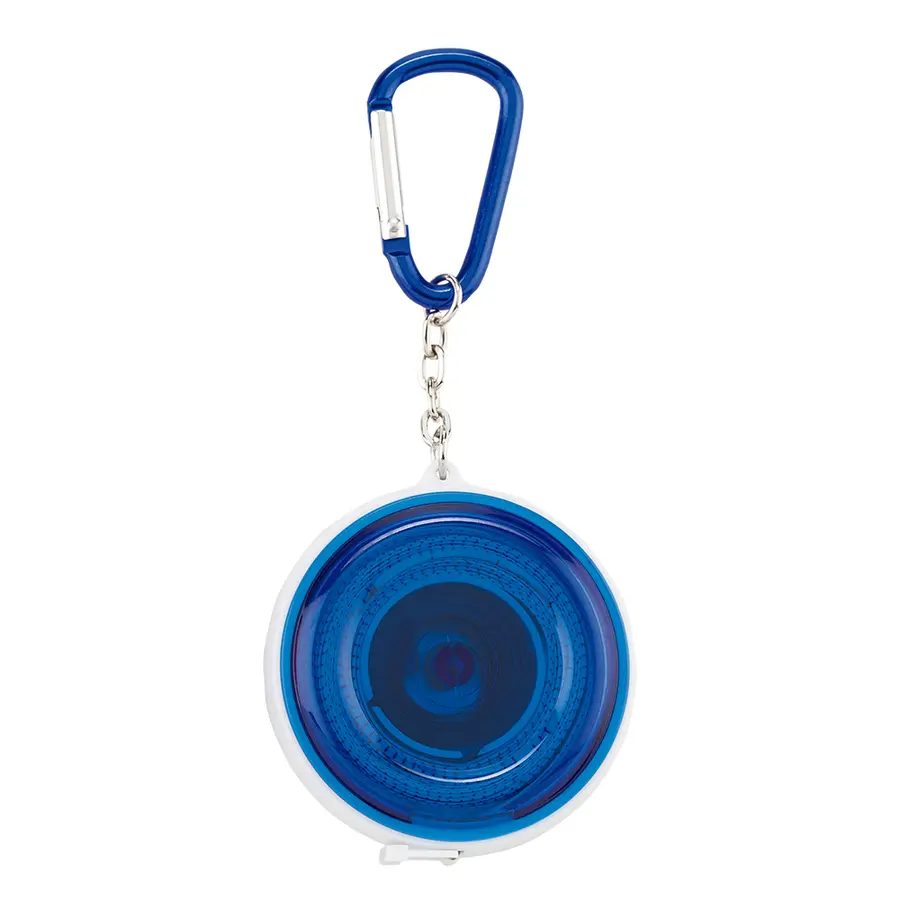 Metro de 1.50 m en plástico con carabinero y botón a presión para recoger la cinta.