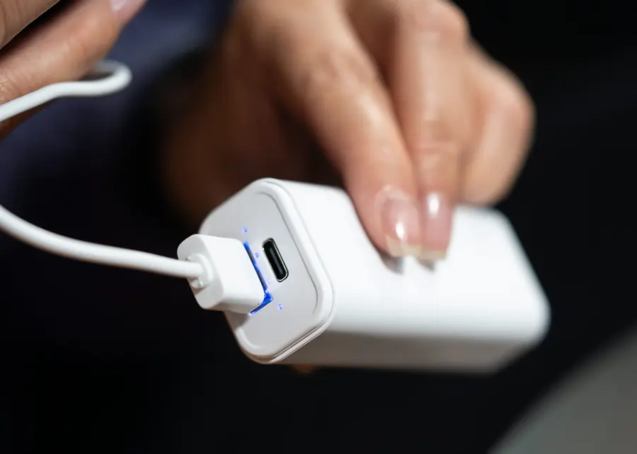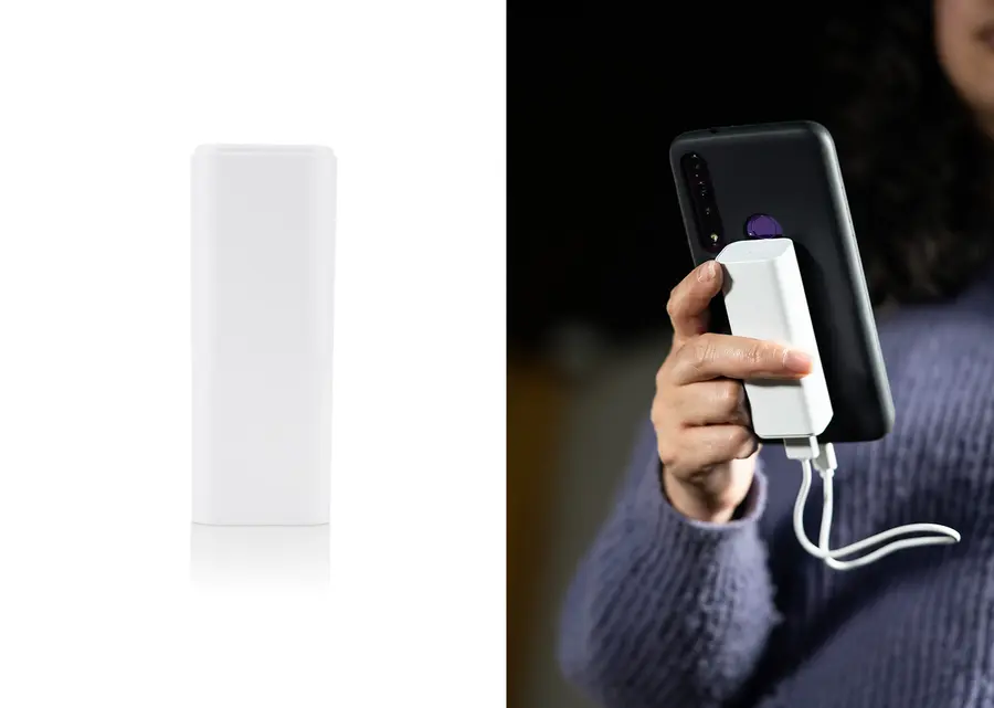 Batería externa portátil diseñada para satisfacer tus necesidades de carga en situaciones de emergencia. Compacta, cabe en una mano. Con función de soporte para teléfono. Entrada y salida tipo C, Salida tipo C. Batería: Litio 21700