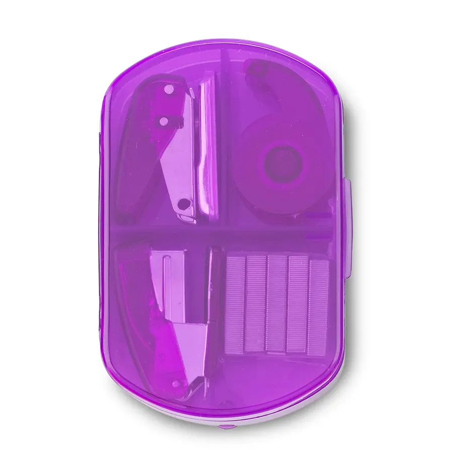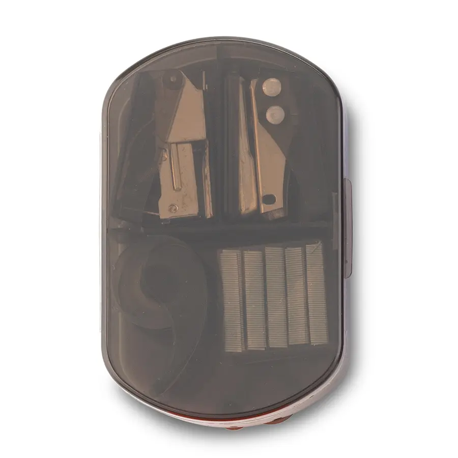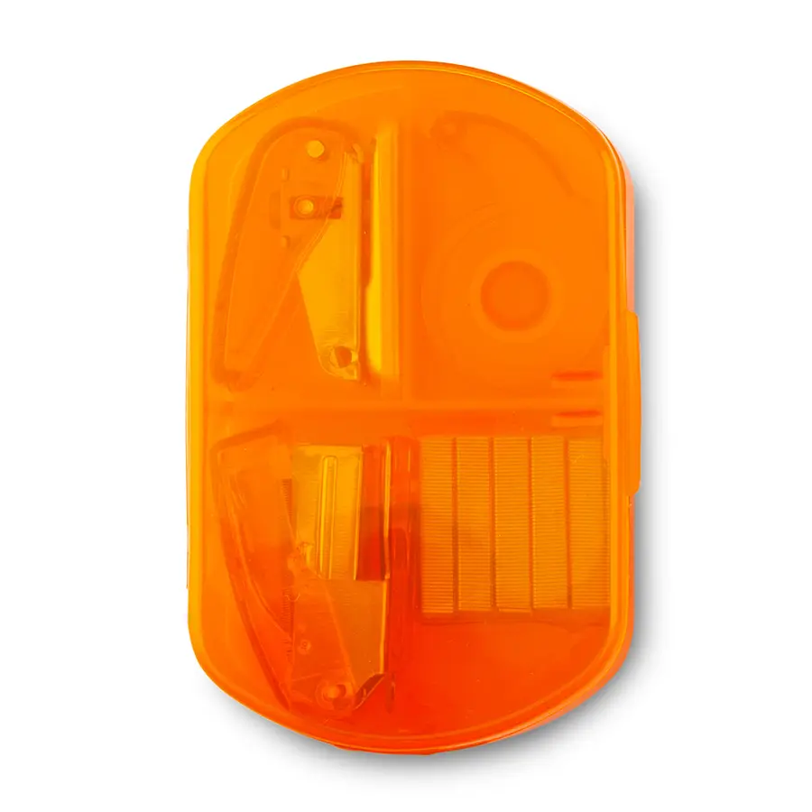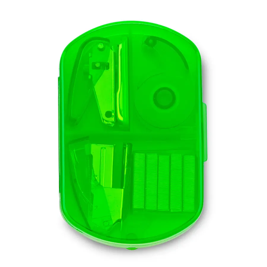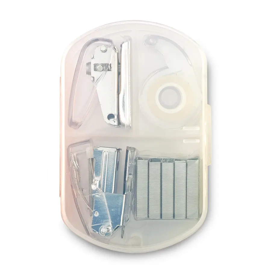 Incluye: Dispensador de cinta, cosedora, perforadora de un hueco y ganchos para cosedora.