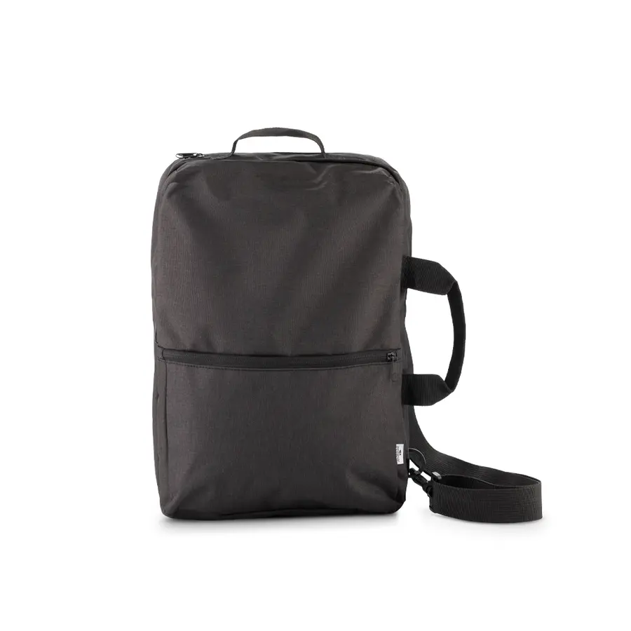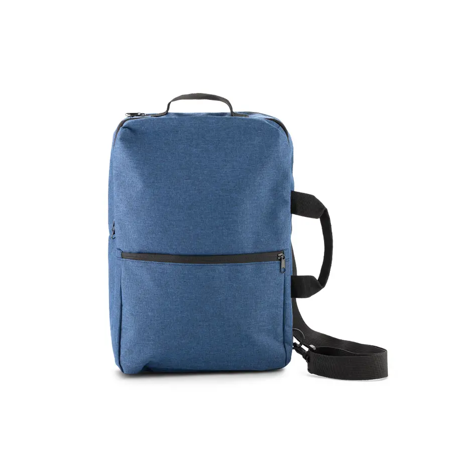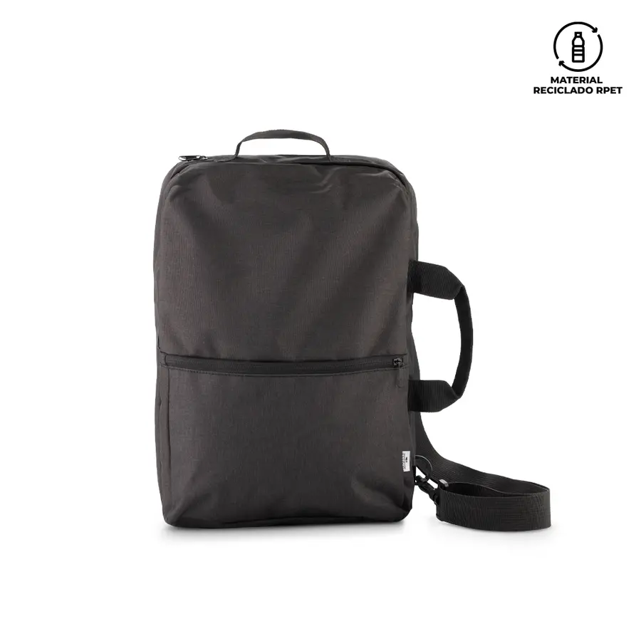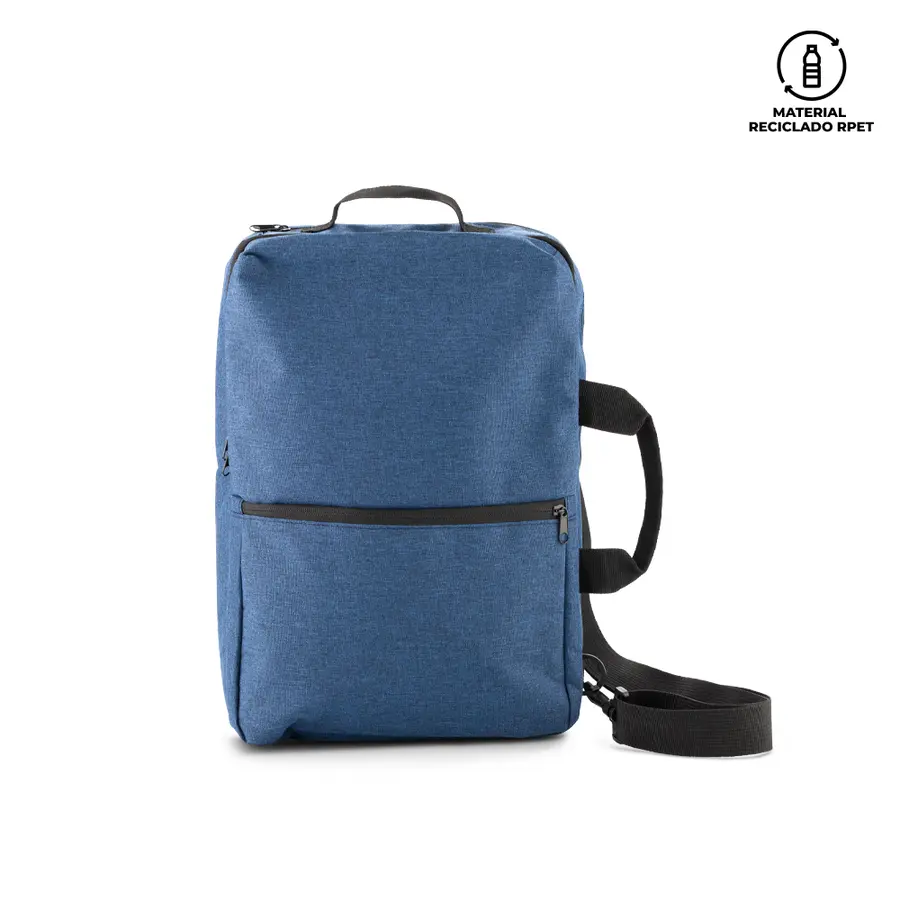 Morral backpack en poliéster RPET. Apto para portátil de hasta 15″. Tres bolsillos externos con cremallera. Manija en reata para colgárselo.