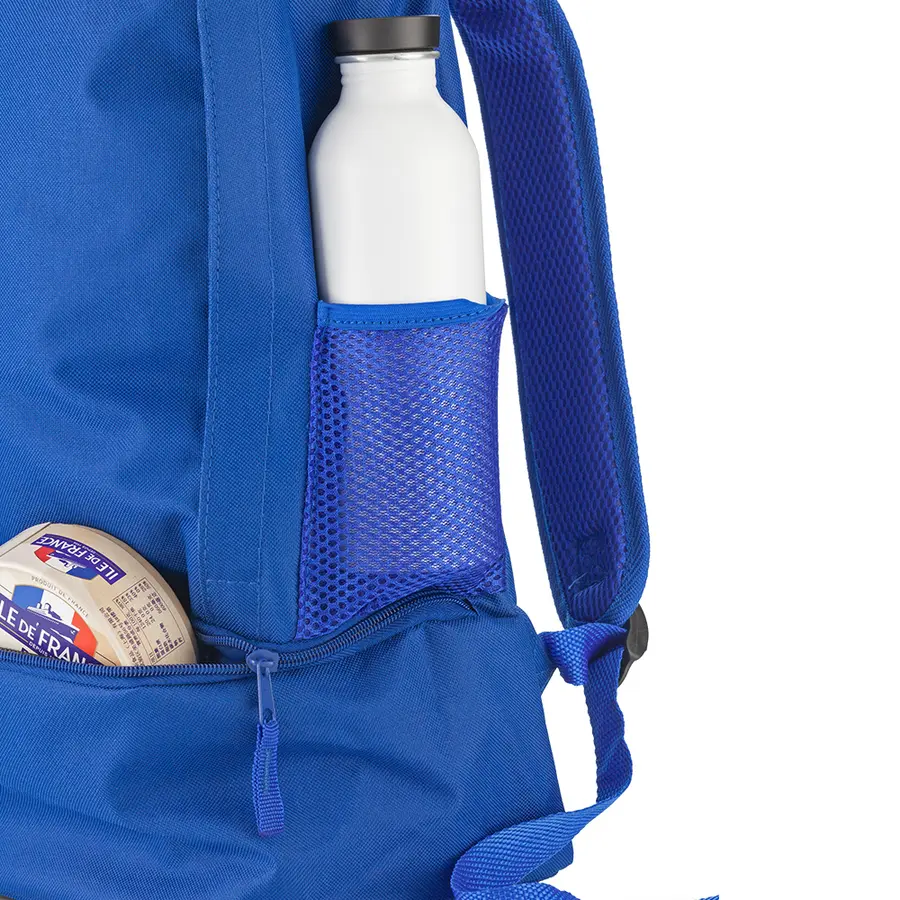 Morral en poliéster, con bolsillo frontal con cremalleray bolsillo lateral en malla portabotella. Con bolsillo guarda zapatos.