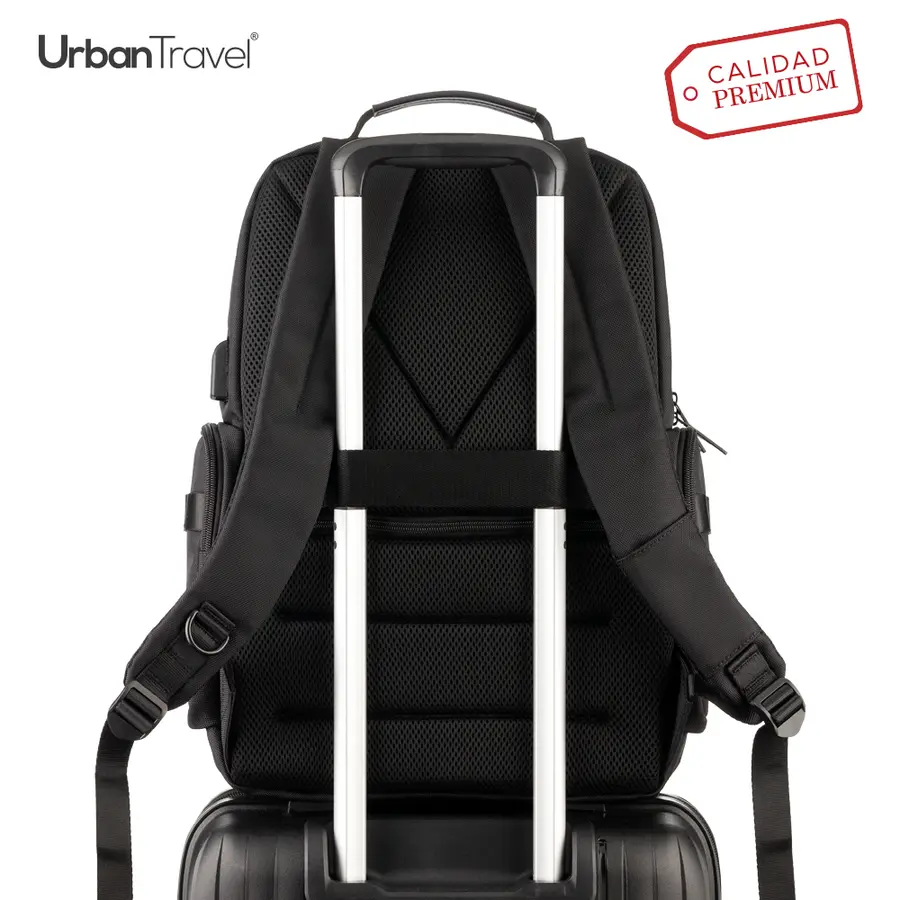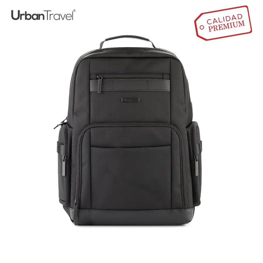 Morral backpack en poliéster. Apto para portátil de hasta 15″. Tres bolsillos externos con cremallera. Un bolsillo externo sin cremallera. Dos bolsillos laterales con cremallera. Puerto USB para cargar desde el interior (no incluye la pila). Bolsillo esco