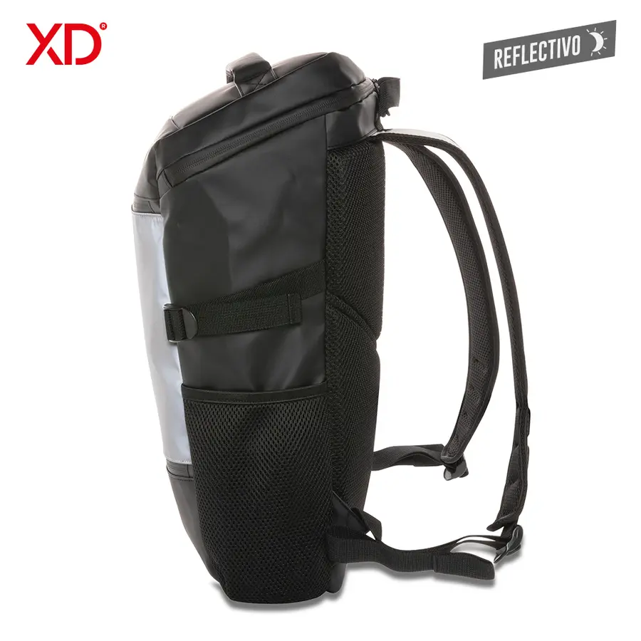 Morral en poliéster y poliuretano, compartimento principal con bolsillo para portátil de 15,6 y un bolsillo pequeño para teléfono o llaves. Dos bolsillos frontales, dos mallas laterales y espaldar acolchado. Piezas reflectivas de gran tamaño en la parte frontal y cargaderas para aumentar la visibilidad. Resistente al agua (no sumergible).