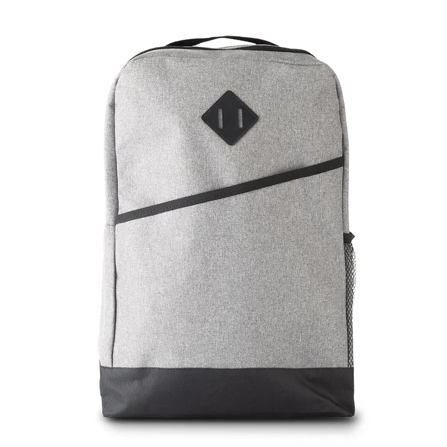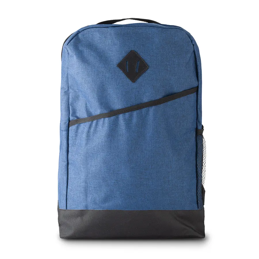 Morral en poliéster, bolsillo frontal y malla lateral portabotella.